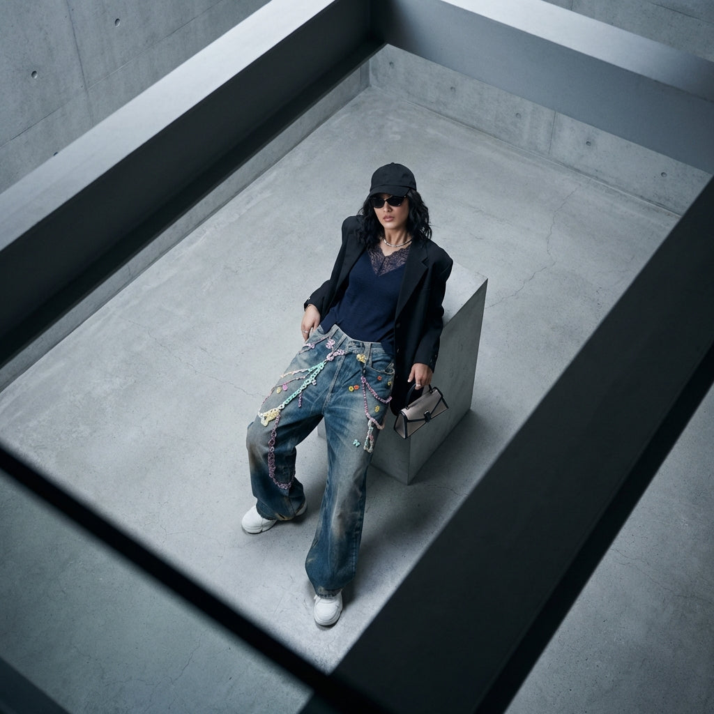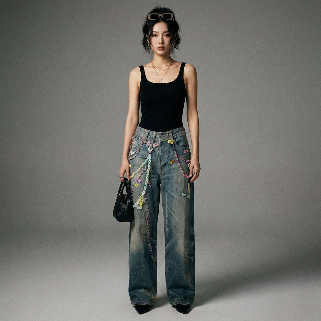 أكّدي أسلوبك مع هذا الجينز المستقيم بطبعة سلسلة الحلوى ثلاثية الأبعاد، قطعة جريئة تجمع بين الراحة والأصالة. قصته الفضفاضة وتصميمه الفريد يجعلان منه قطعة أساسية لإطلالة عصرية ومريحة! 🍬