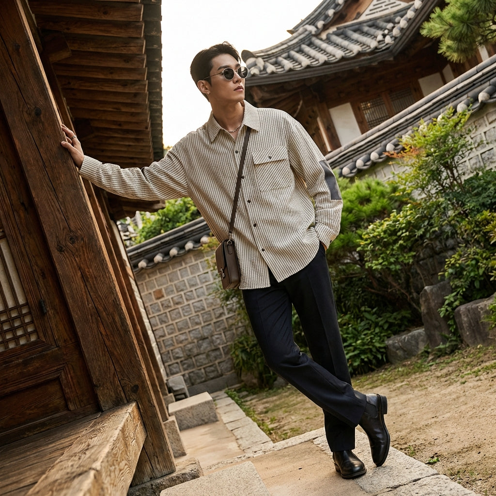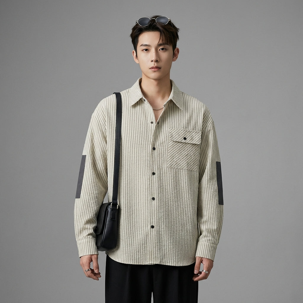 Chemise homme rayée beige décontractée - K-fashion Coréenne
