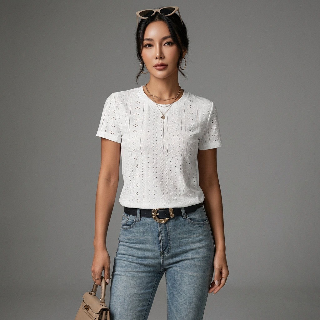اعتمدي إطلالة أنيقة وعصرية مع تي شيرتنا البسيط، المصمم لإبراز جمال قوامك. قصته الضيقة وياقته المستديرة تجعله قطعة أساسية متعددة الاستخدامات لجميع إطلالاتك. مثالي لمظهر أنيق وعصري! ✨