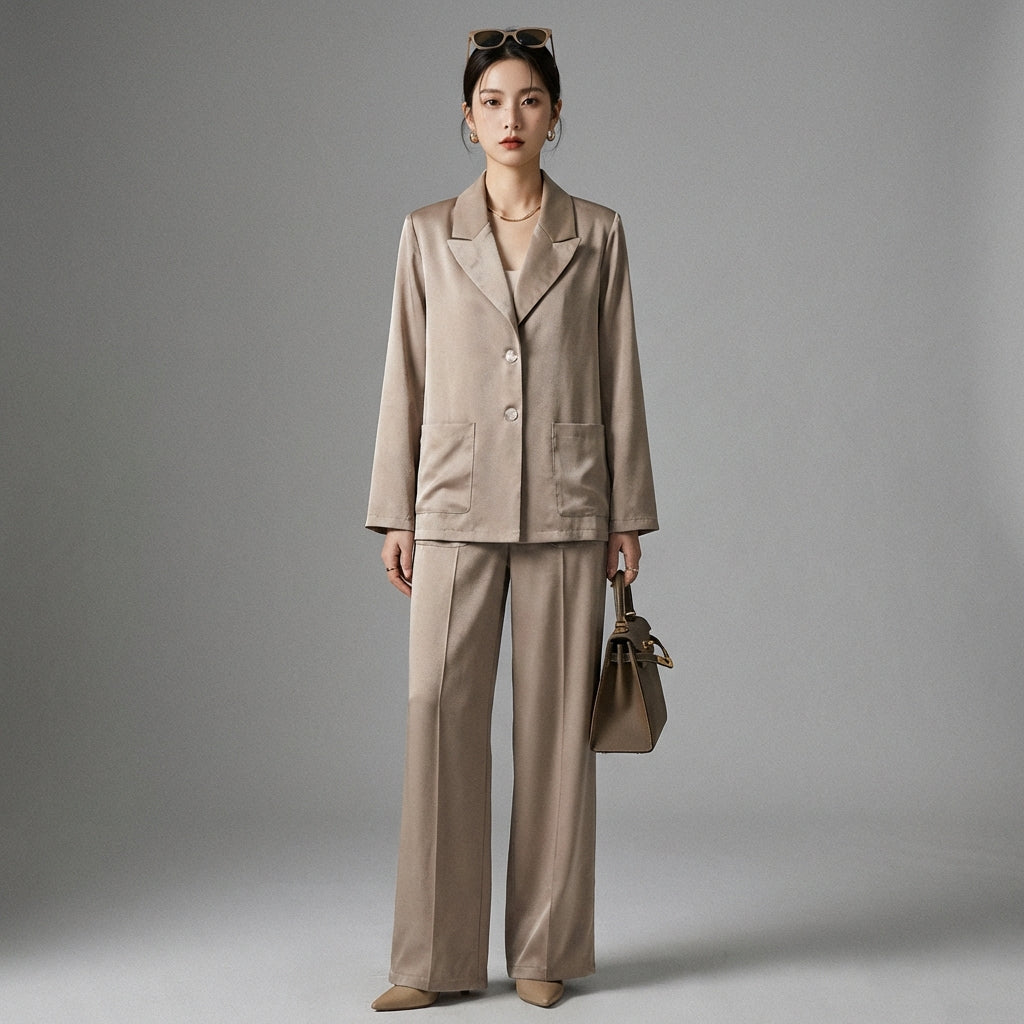 طقم البدلة هذا هو القطعة الأساسية لخزانة ملابس أنيقة وعملية، مما يتيح لك الانتقال بسهولة من المكتب إلى النزهات الكاجوال بلمسة من الأناقة المعاصرة.