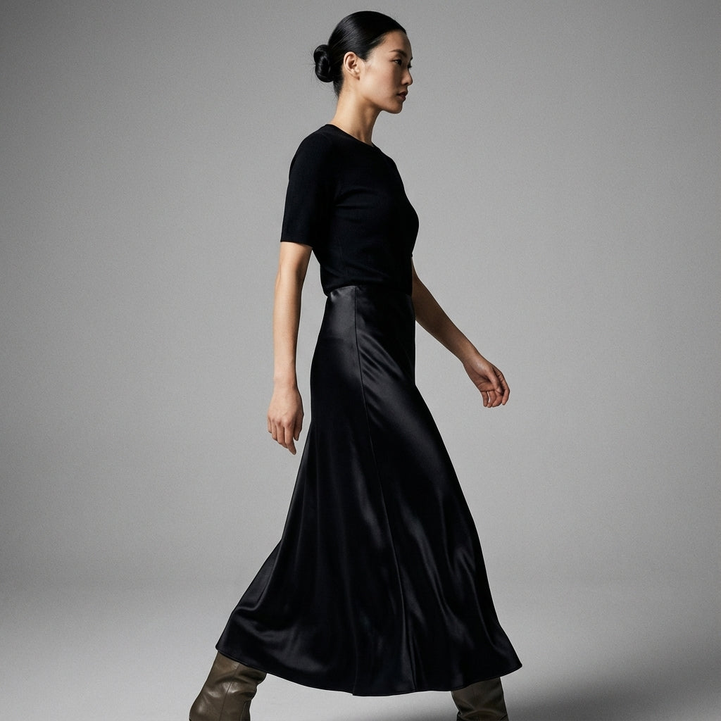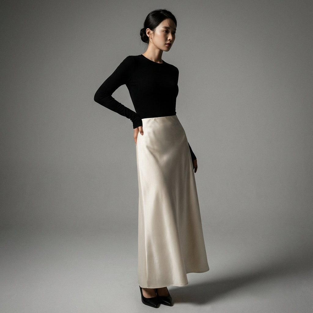 - النوع: تنورة طويلة، خصر عالي. قصتها الجذابة تبرز القوام وتوفر مظهرًا راقيًا.