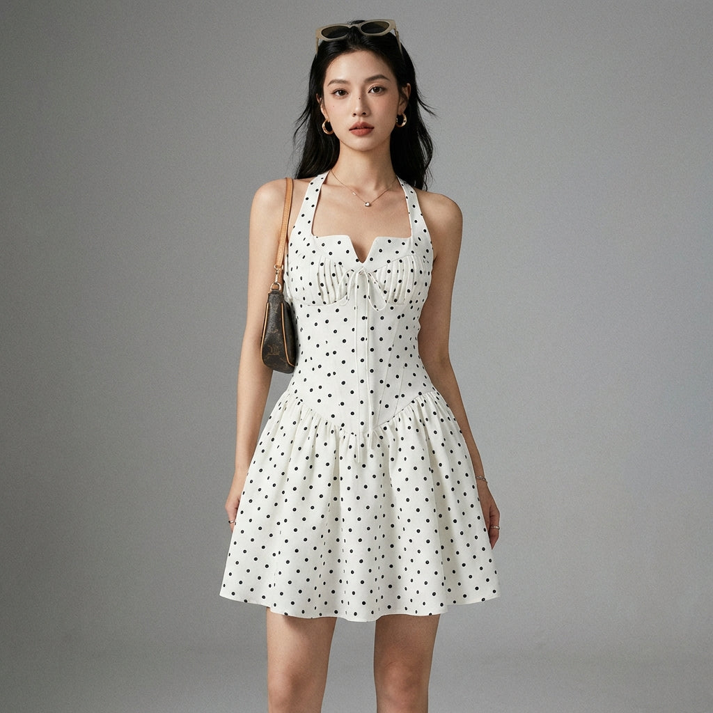 اعتمدي أسلوب الشارع الجريء مع فستاننا القصير ذو الحمالات، والذي يتميز بياقة مربعة وخصر عالٍ للحصول على قصة جذابة. يضيف نمط النقاط وتنورة البف لمسة من الحداثة والخفة، مثاليًا للأيام المشمسة! ☀️