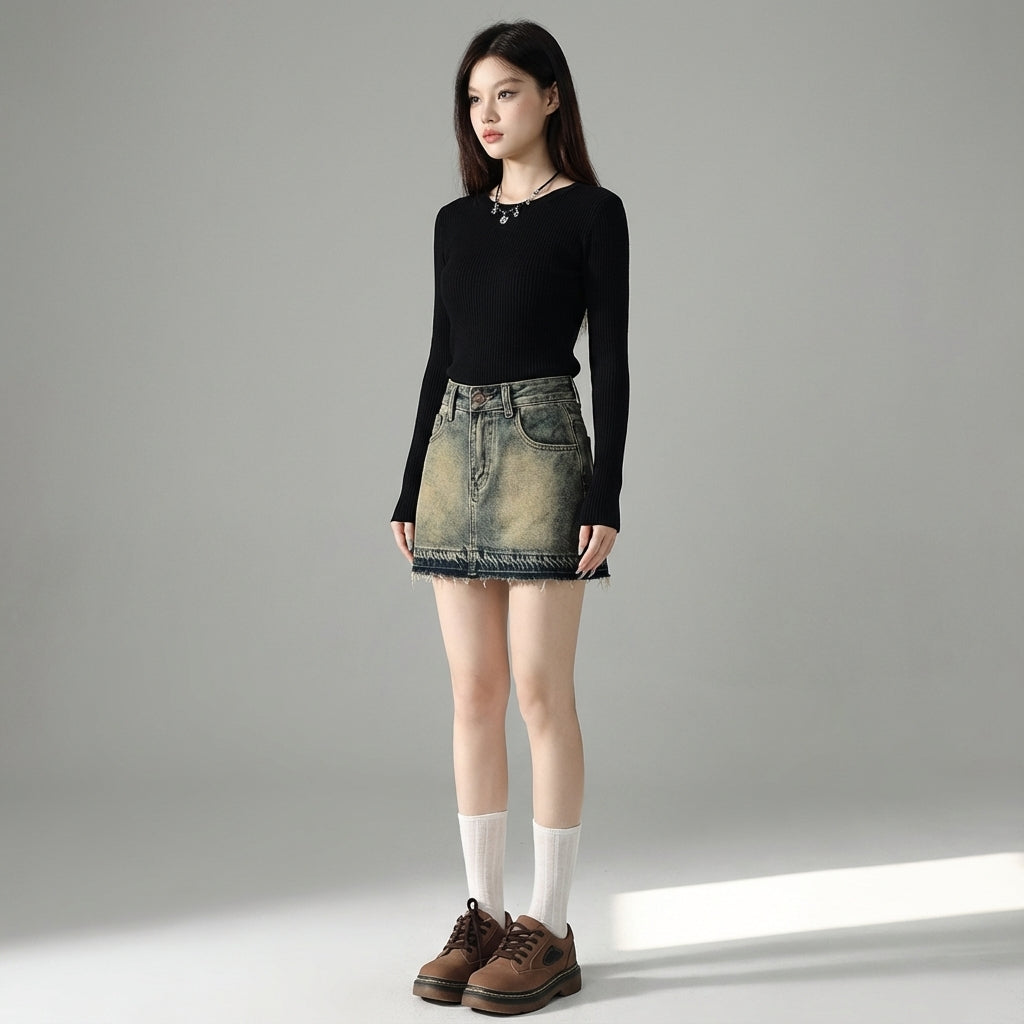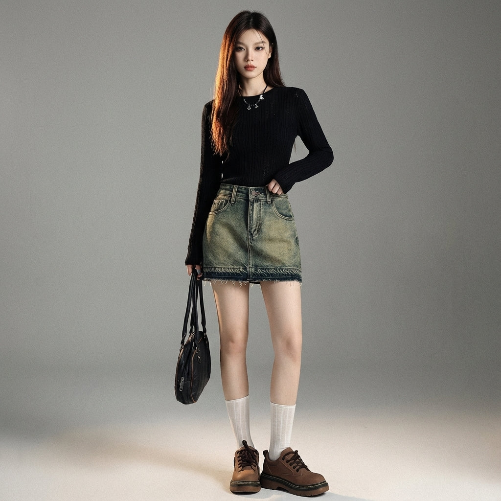 Affirmez votre style avec notre mini-jupe en jean délavé, une pièce emblématique de la mode coréenne. Sa coupe taille haute et ajustée sublime la silhouette, tandis que les détails vintage lui confèrent un charme unique. Parfaite pour un look urbain et tendance ! ✨