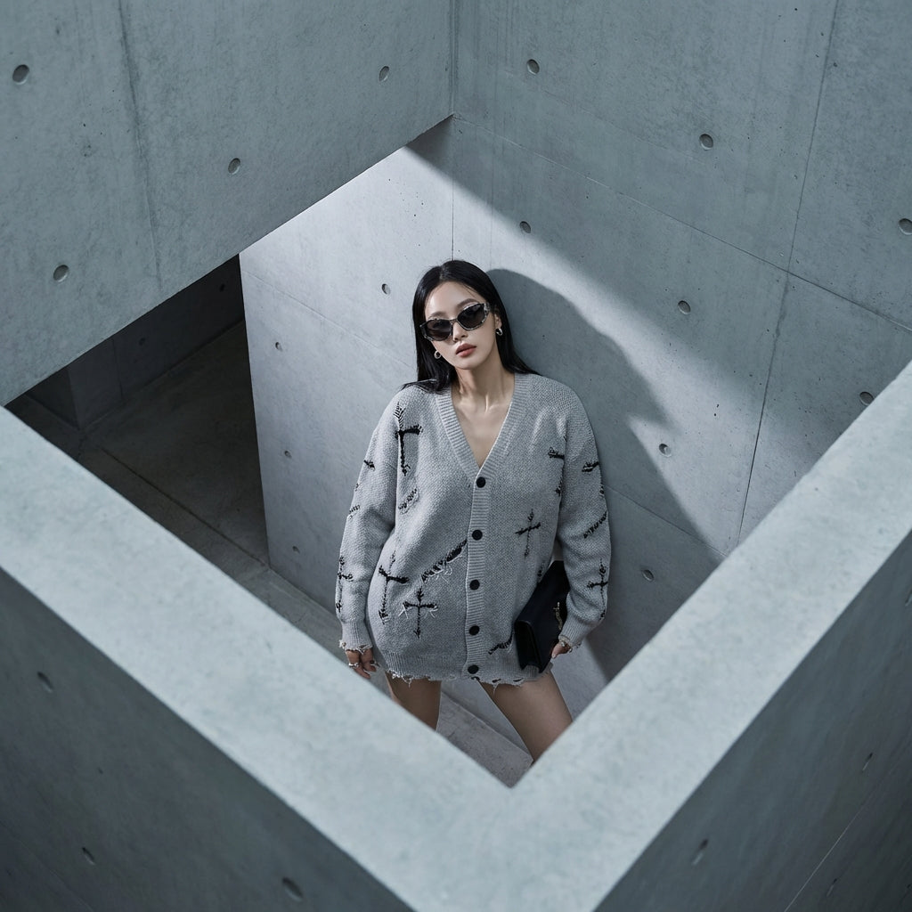 Cardigan Jacquard gris à col V pour un look streetwear décontracté. Mode coréenne.