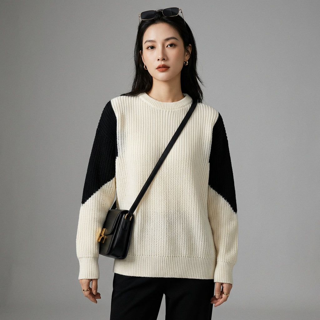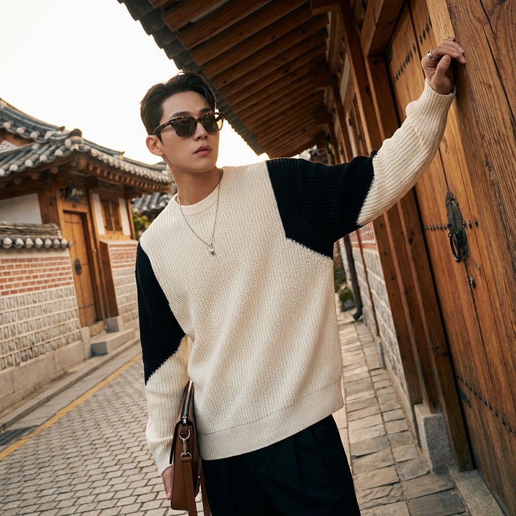 - Style : Streetwear, K-fashion, Moderne, Décontracté. Ce pull incarne l'esprit de la mode coréenne contemporaine avec son design color block et sa coupe oversize.