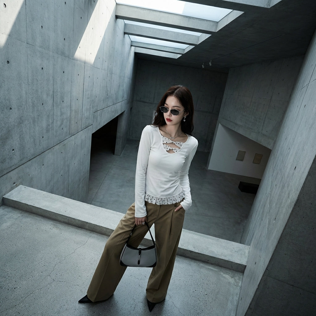 - Type : Slim Fit, Cropped. Une coupe ajustée et courte qui met en valeur la taille et s'associe parfaitement avec des pantalons ou jupes taille haute.