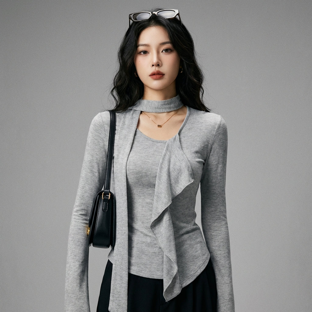 Adoptez un look chic et raffiné avec notre T-Shirt à col V, orné de volants délicats et d'un design asymétrique. Sa coupe ajustée mettra en valeur votre silhouette pour un style élégant et moderne ! ✨