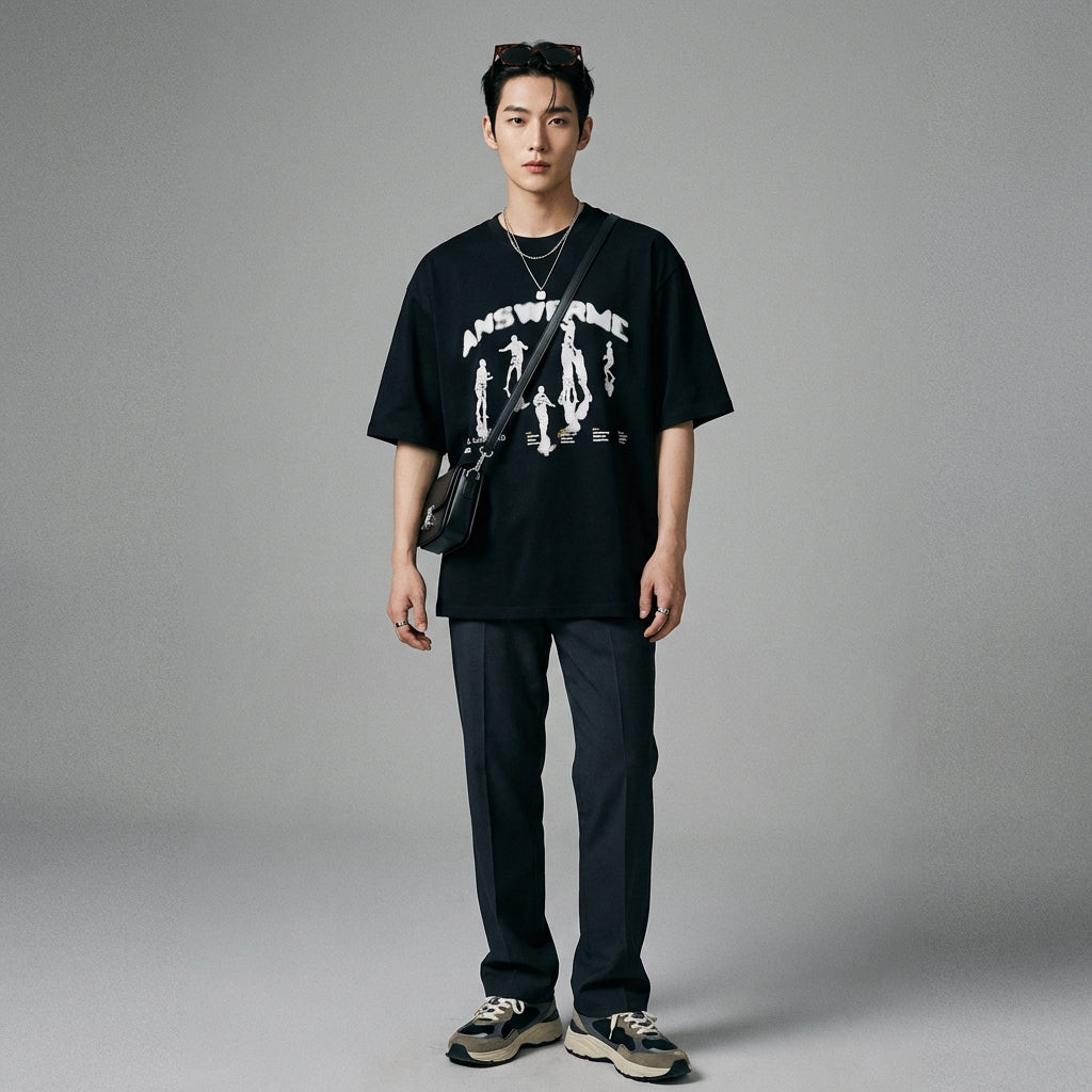 - Style : Streetwear, K-fashion, Urbain. Ce t-shirt incarne l'essence du style streetwear coréen, avec une touche de modernité pour un look sans effort.
