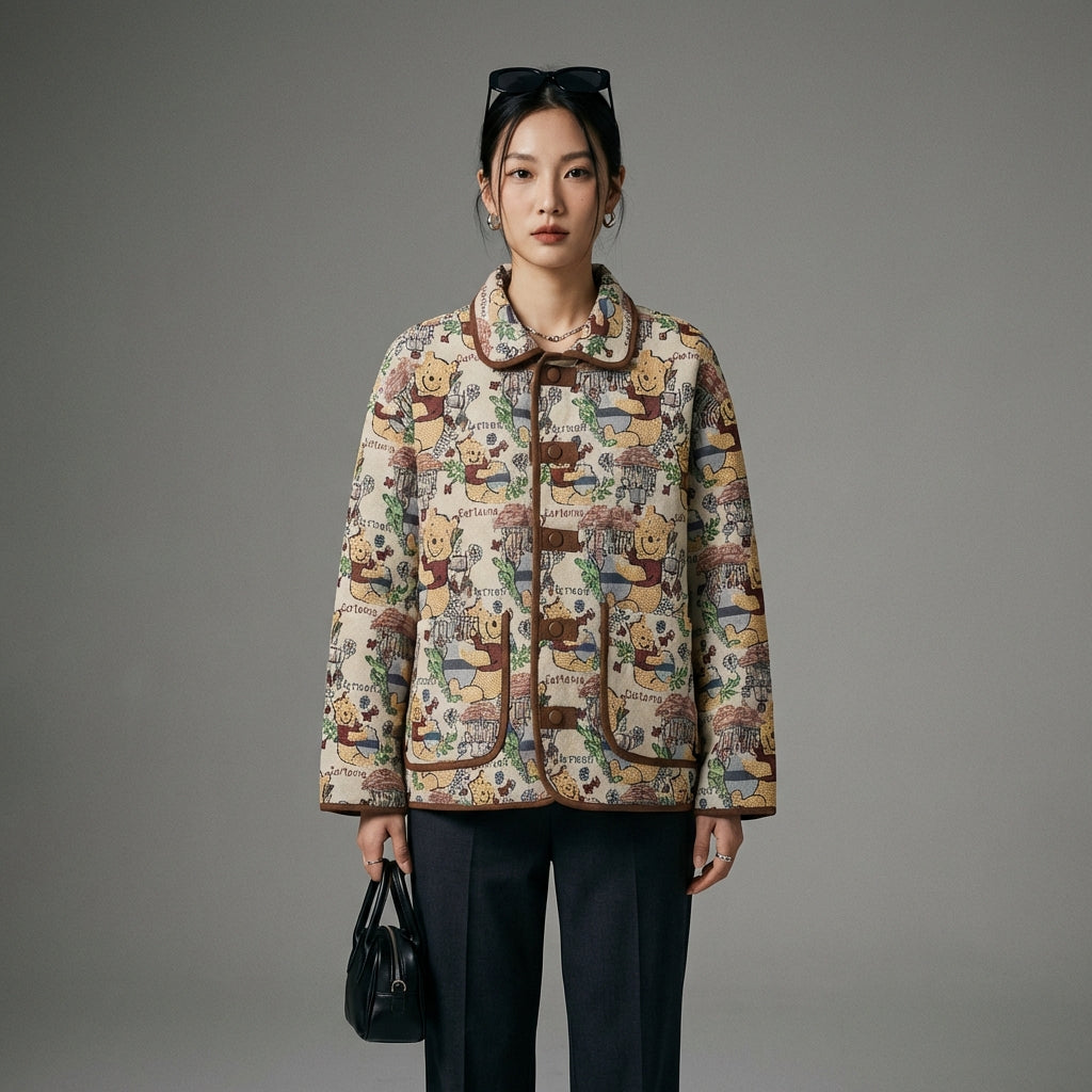 Veste jacquard ours rétro marron, coupe ample, col revers - Koreanxwear