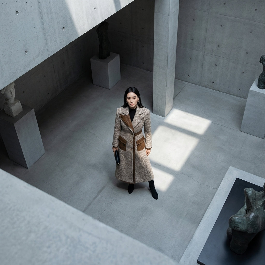 - Type : Coupe allongée, boutonnage simple. Sa silhouette épurée et sa longueur généreuse offrent une allure distinguée et moderne, adaptée à diverses occasions.