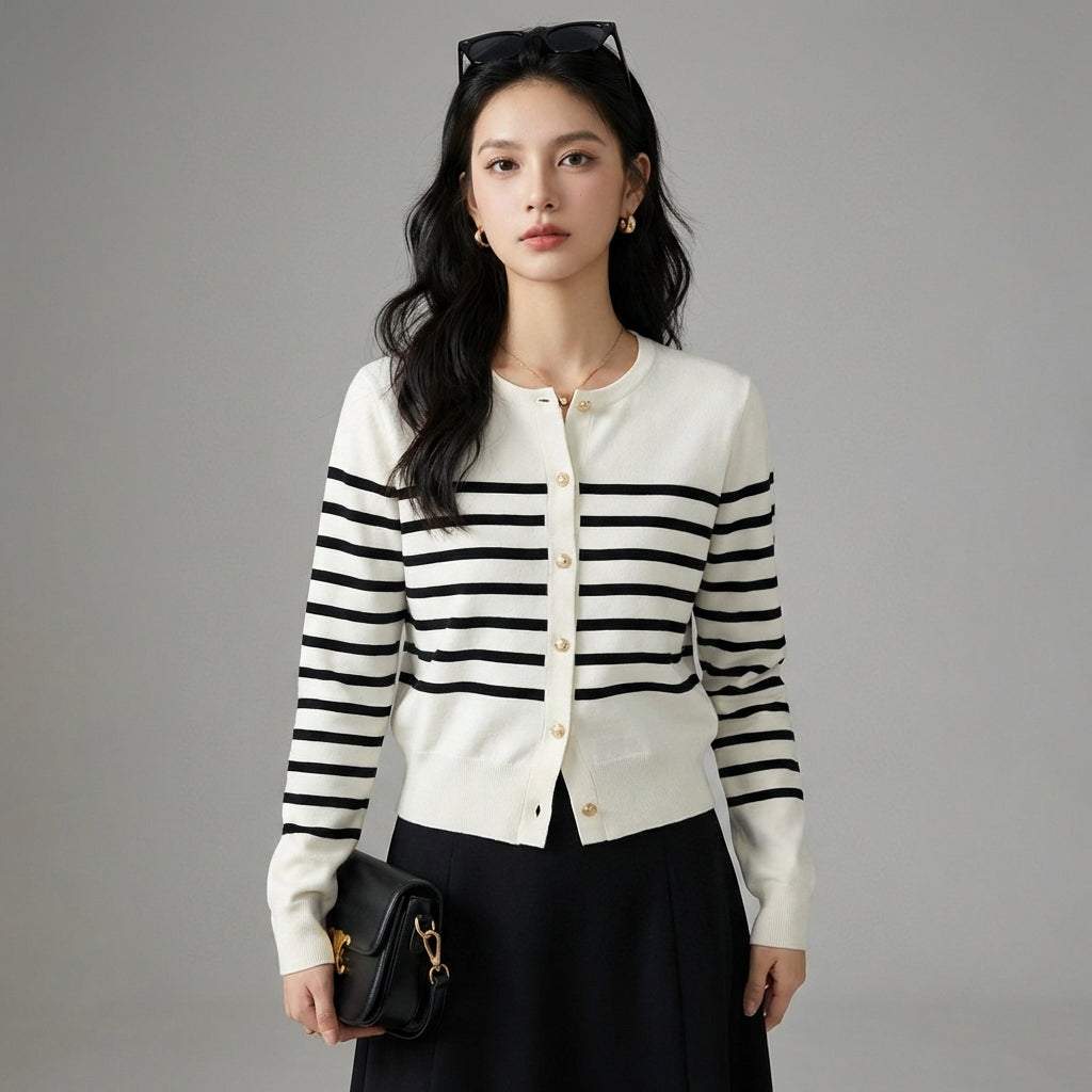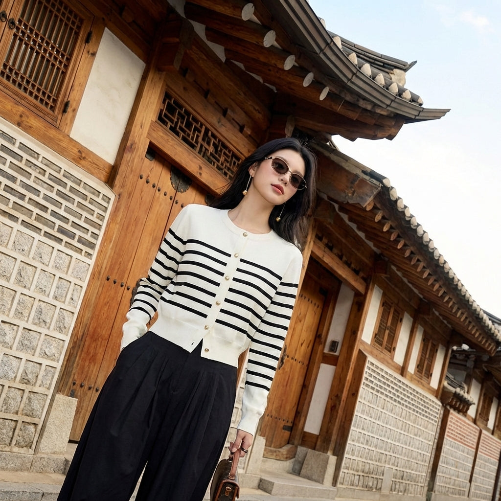 Tento pruhovaný kardigan je ideálním kouskem k doplnění vašich outfitů s nádechem sofistikovanosti a pohodlí, odrážející podstatu korejské módy.