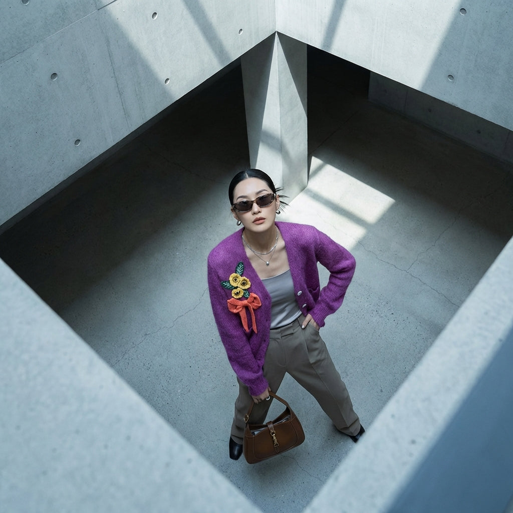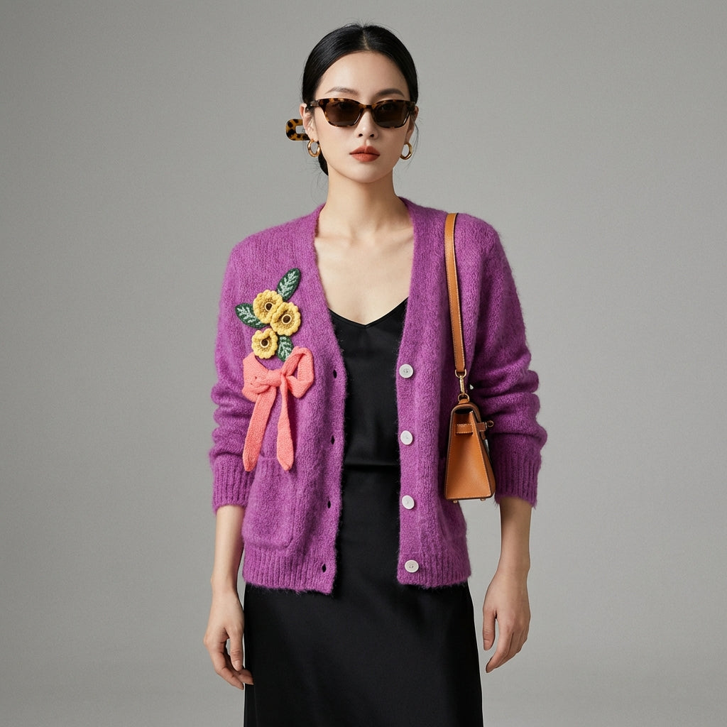Tento fialový květinový kardigan je nezbytným doplňkem vašeho šatníku, který kombinuje pohodlí a styl s nádechem korejské elegance.