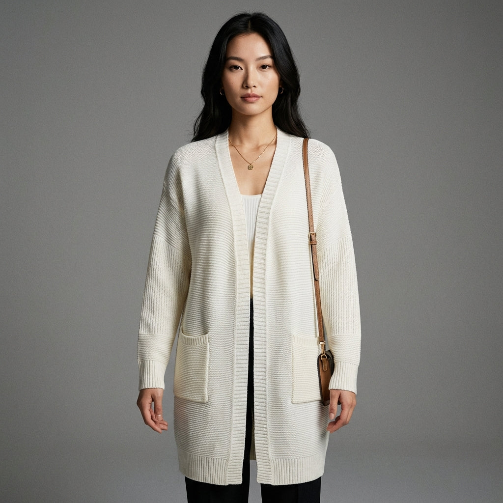 - Styl: Ležérní, minimalistický, K-fashion. Tento kardigan ztělesňuje jednoduchou eleganci a pohodlí, ideální pro streetwear styl nebo ležérní elegantní nádech.