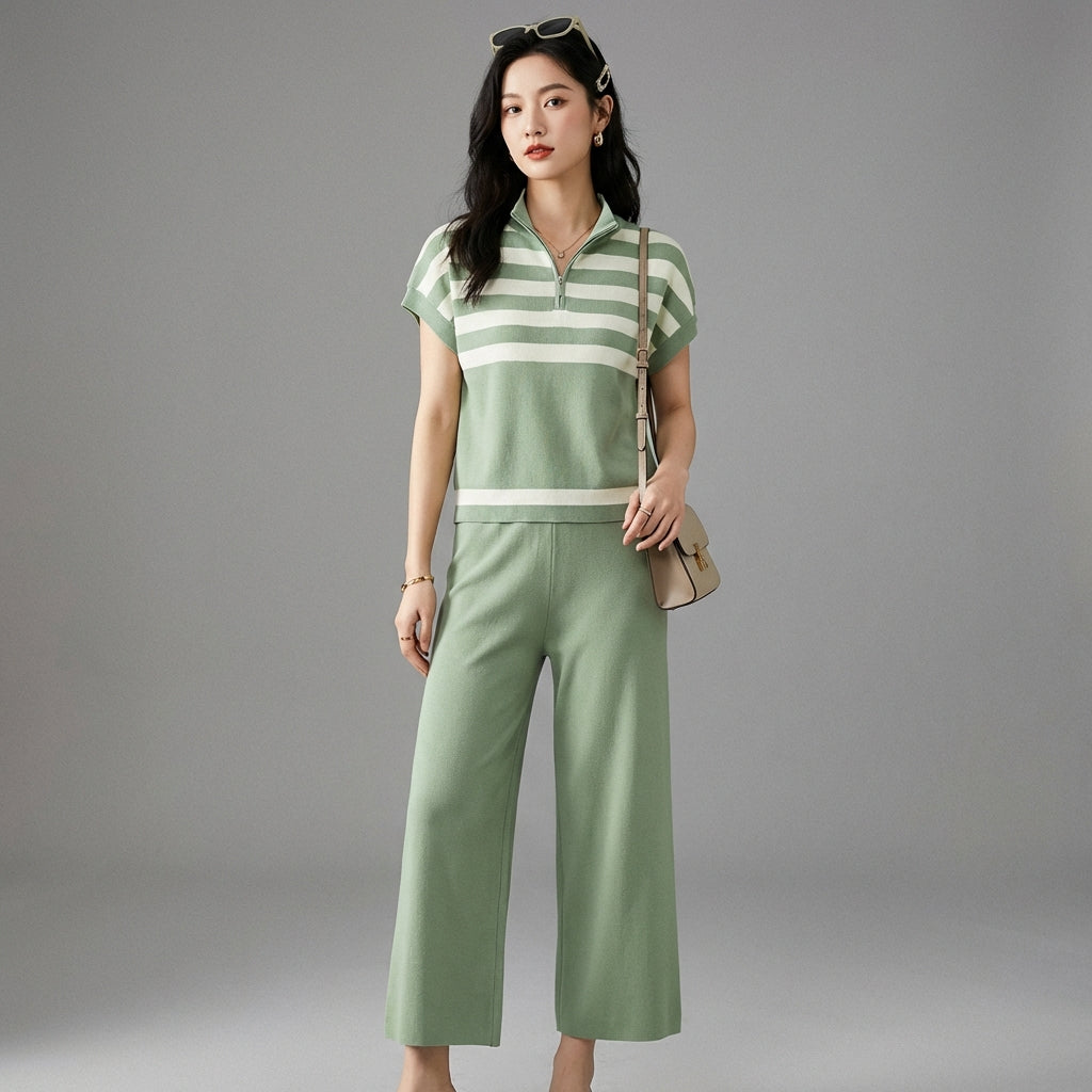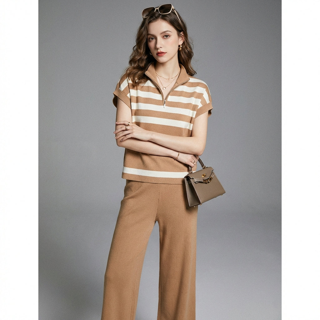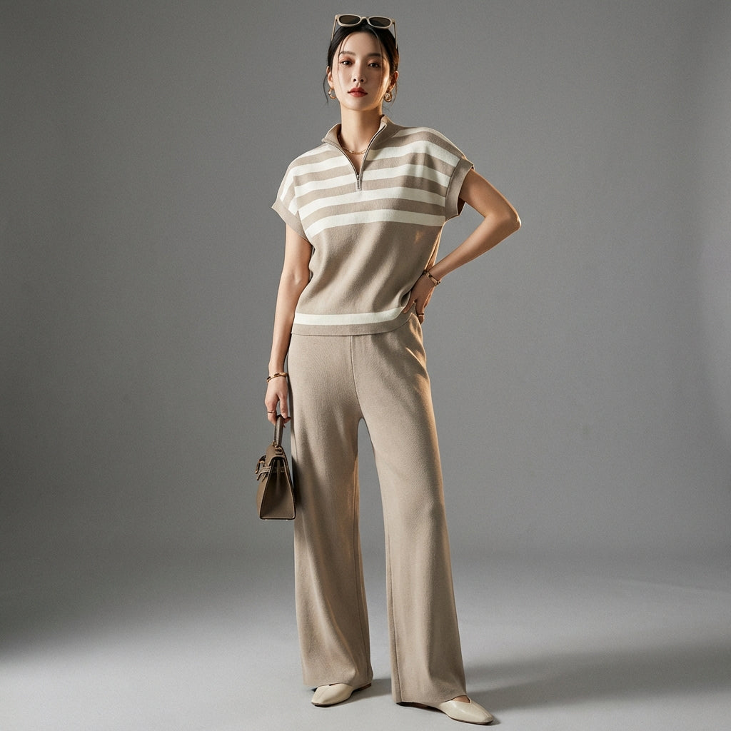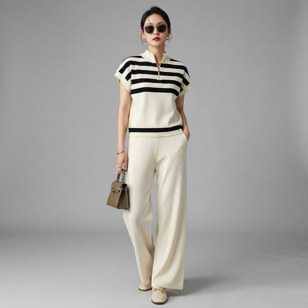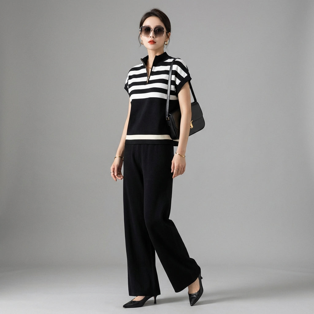 Objevte moderní eleganci s tímto dvoudílným kompletem, který zahrnuje pruhovaný top na zip a široké kalhoty s vysokým pasem. Perfektní pro šik a ležérní siluetu, tento komplet dodá nádech sofistikovanosti vašemu každodennímu šatníku! ✨