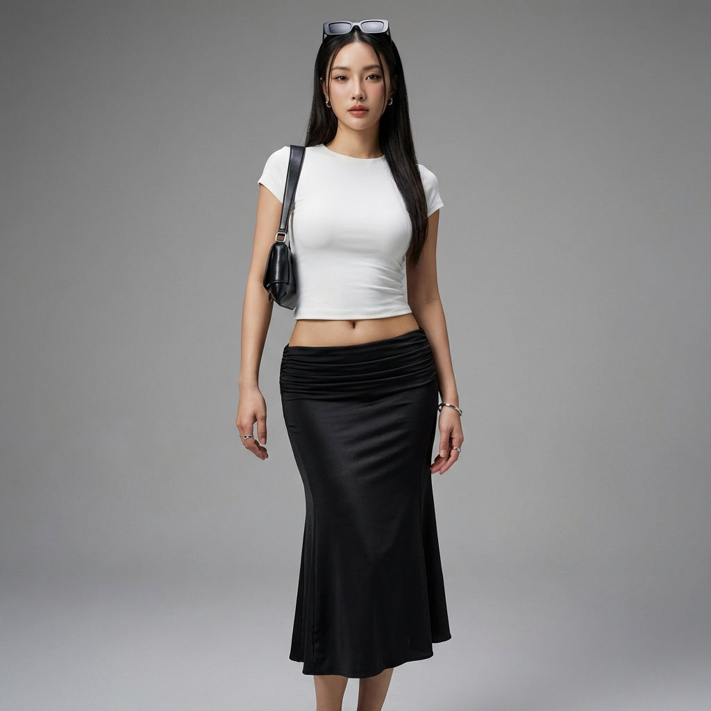 - Styl: Korejská móda, Elegantní, Minimalistický. Tato sukně ztělesňuje moderní sofistikovanost K-fashion, ideální pro šik a čistý styl.