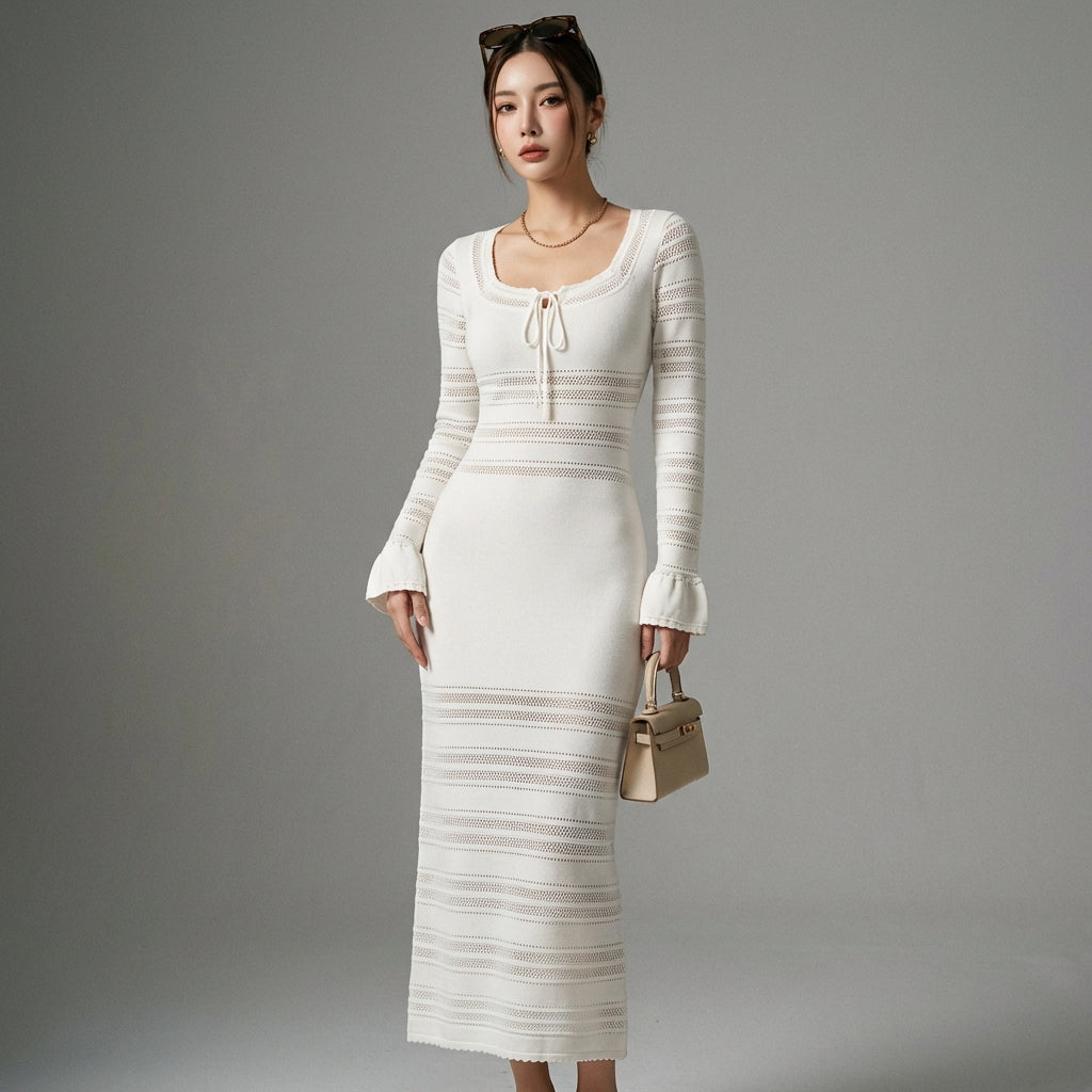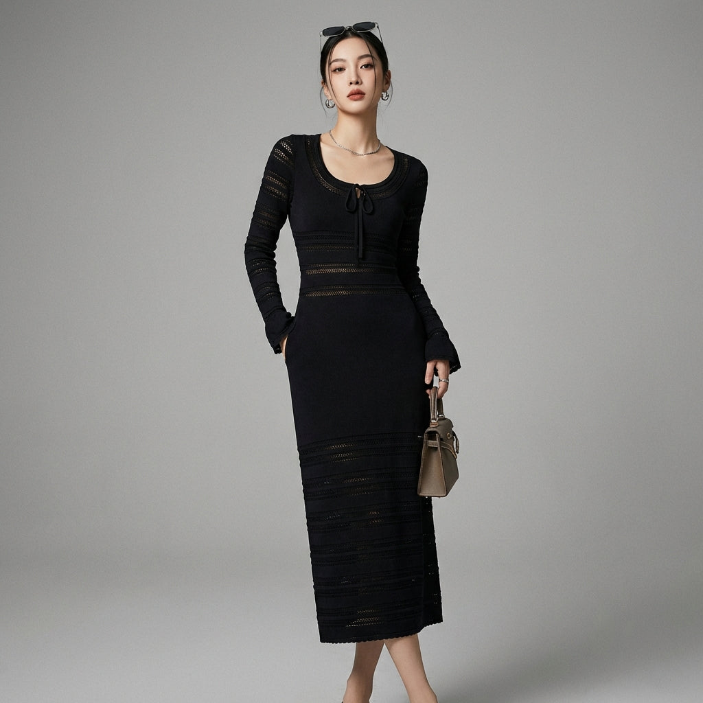 Objevte naše dlouhé pletené šaty, elegantní a moderní kousek s hranatým výstřihem a vypasovaným střihem. Perfektní pro šik a ležérní vzhled, jemně zvýrazní vaši siluetu. Ideální pro chladné dny nebo stylové večery! ✨