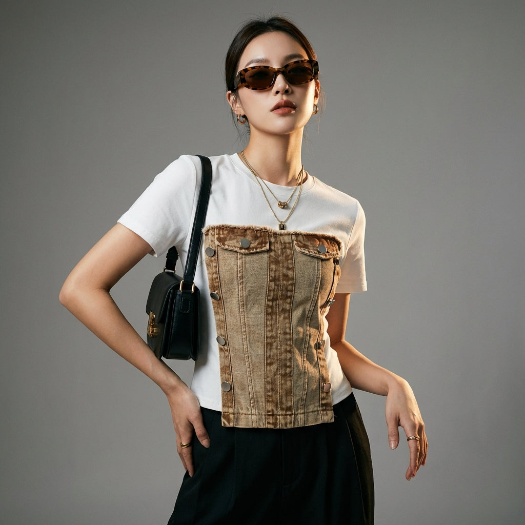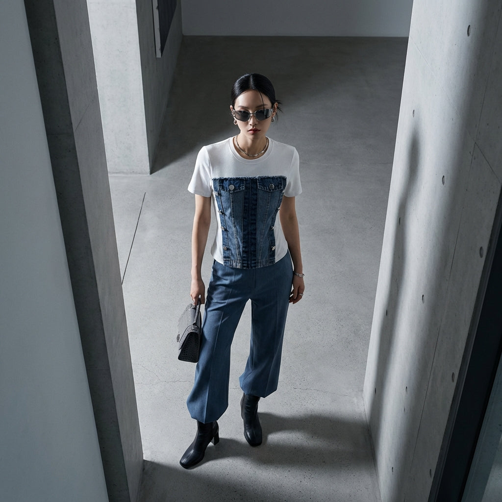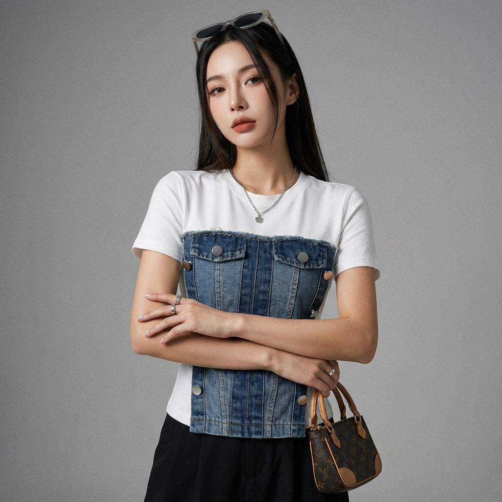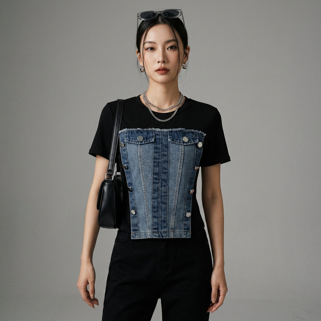 Toto dvoudílné džínové tričko je kousek, který potřebujete pro výrazný a pohodlný styl. Snadno se kombinuje s džíny s vysokým pasem nebo sukní pro elegantní a ležérní komplet.
