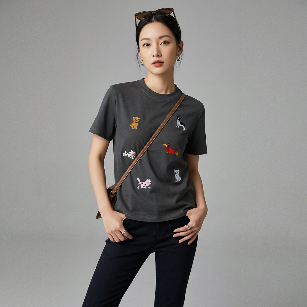 Få et afslappet og trendy look med vores kortærmede T-shirt med rund hals. Det enkle design er fremhævet af en delikat broderi, der giver et strejf af originalitet til dit hverdagsoutfit. Perfekt til en "Spicy Girl"-stil eller blot for absolut komfort! ✨