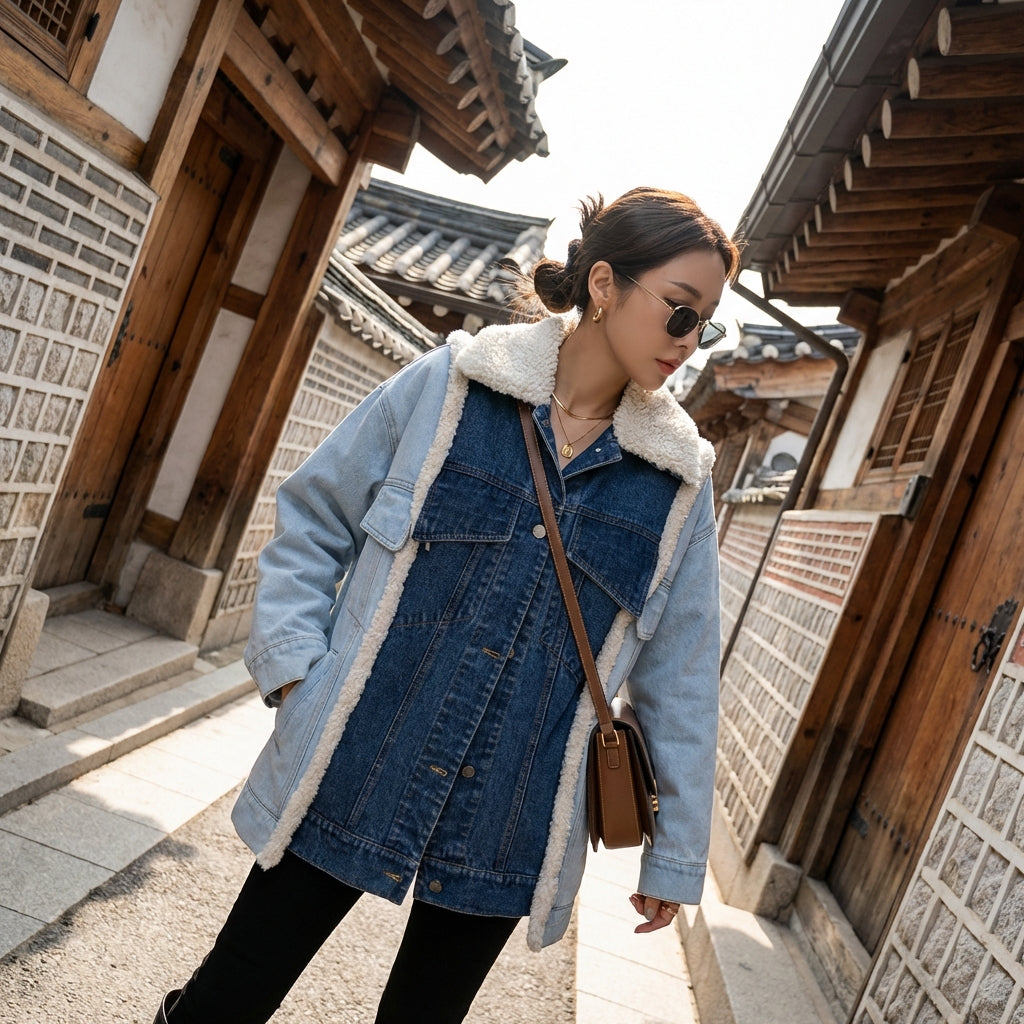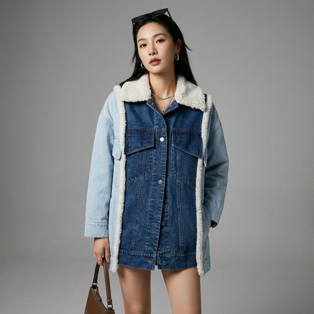 Få et trendy og behageligt look med vores denimjakke, der har en stilfuld krave i imiteret lammeuld. Dens tofarvede design og løse pasform gør den til det perfekte stykke tøj til en afslappet og chic stil! ✨
