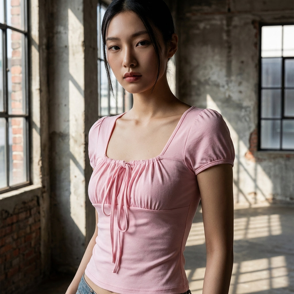 - Stil: Minimalistisk, Urban, K-fashion. Denne T-shirt udtrykker chic enkelhed og modernitet fra koreanske trends, ideel til en ren og sofistikeret stil.