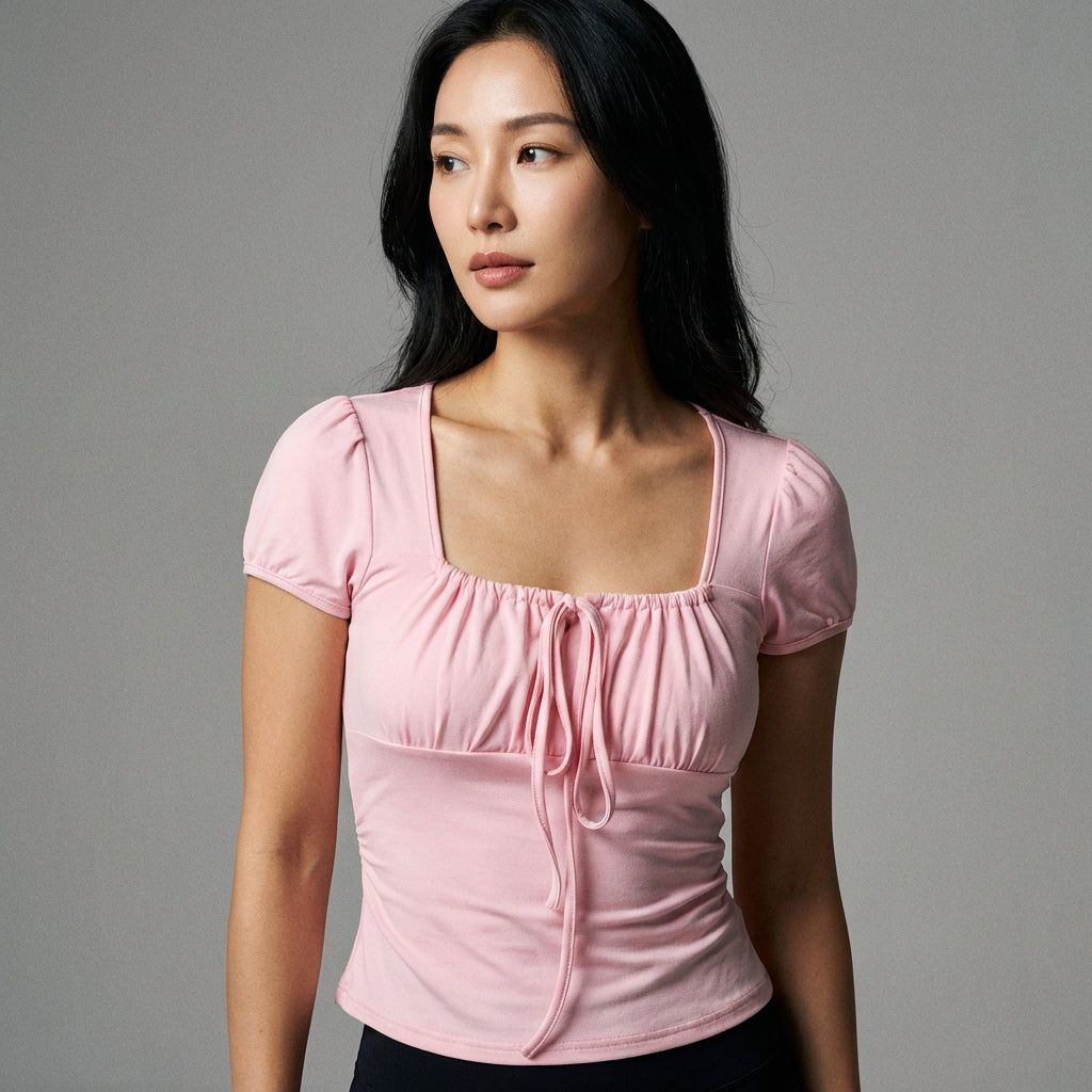 Få et moderne og elegant look med vores slim fit T-shirt med firkantet hals og korte ærmer. Dens tætsiddende pasform fremhæver figuren, mens dens rene design gør den til et uundværligt element i din garderobe. Perfekt til et smart og afslappet look! 💖