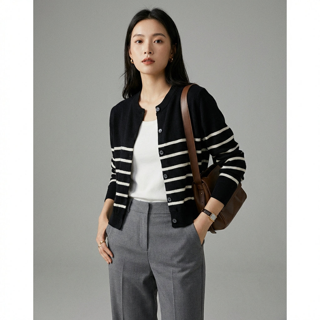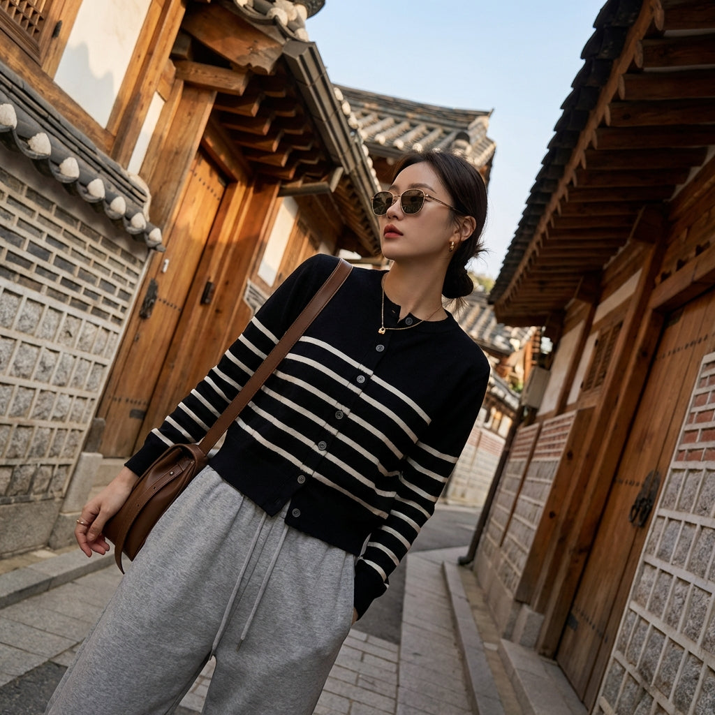 - Stil: K-fashion, Streetwear, Casual chic. Denne cardigan udtrykker moderne elegance med et dristigt touch, typisk for koreansk mode.