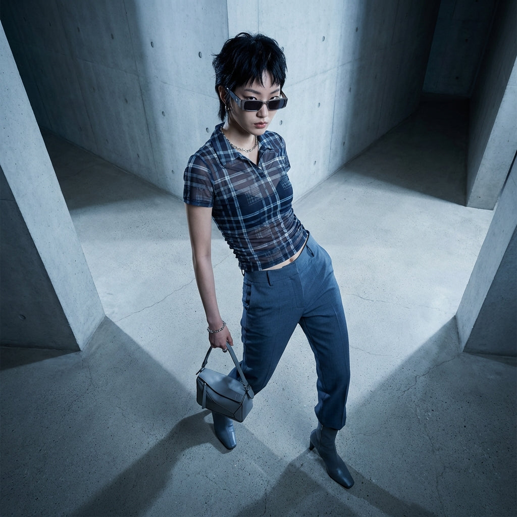 Fremhæv din stil med vores gennemsigtige, ternede crop top, et dristigt stykke tøj, der kombinerer elegance og modernitet. Dens slanke pasform og ternede mønster tilføjer et sofistikeret touch til ethvert outfit. Perfekt til et trendy og selvsikkert look! ✨