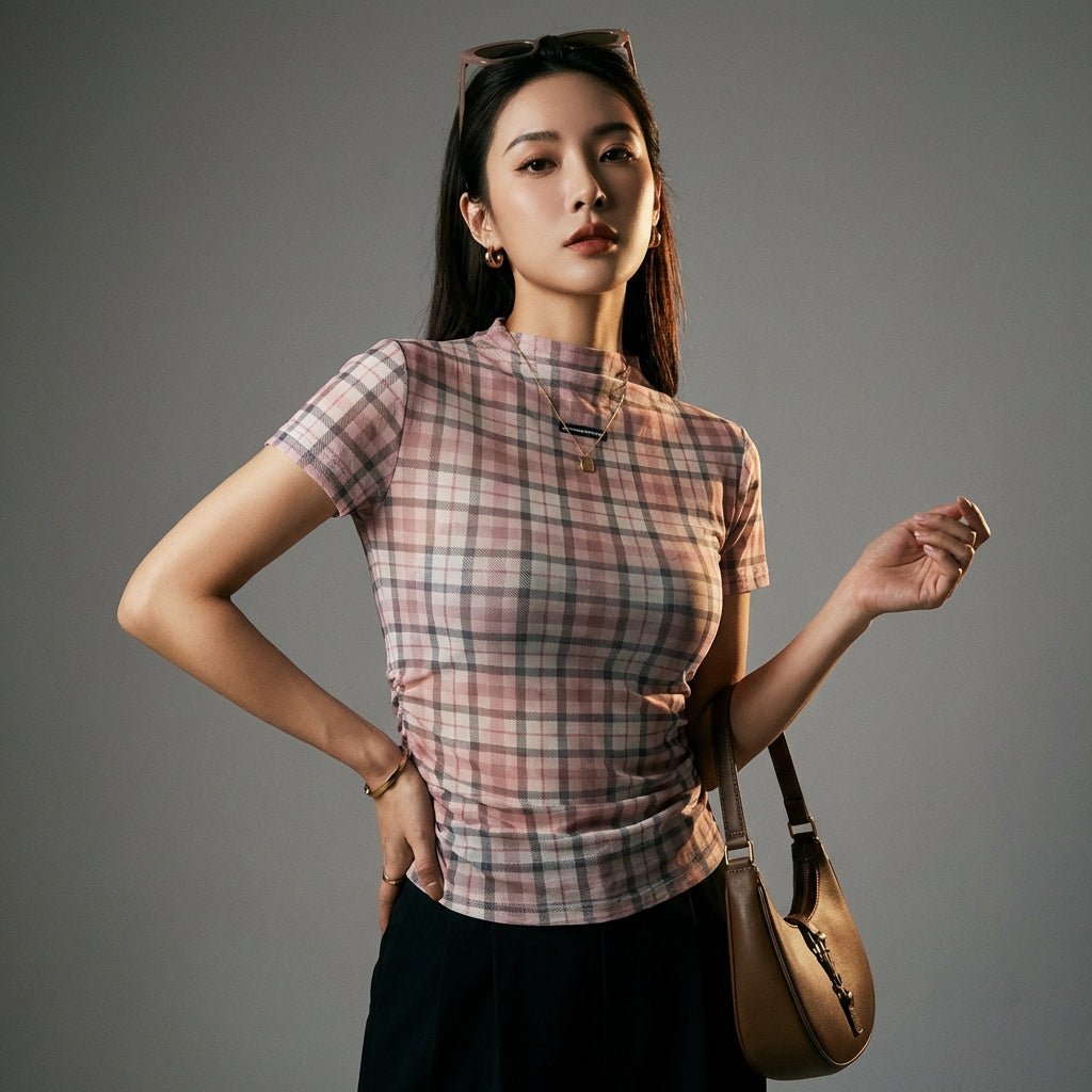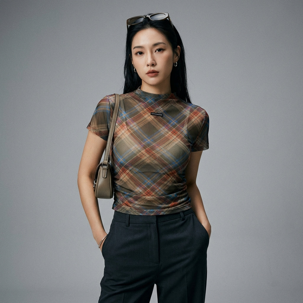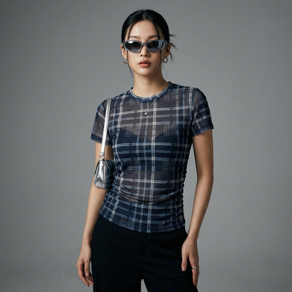 Denne gennemsigtige, ternede t-shirt er et must-have for dem, der ønsker at tilføje et strejf af originalitet og stil til deres garderobe, samtidig med at de forbliver komfortable og elegante.