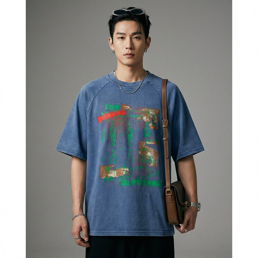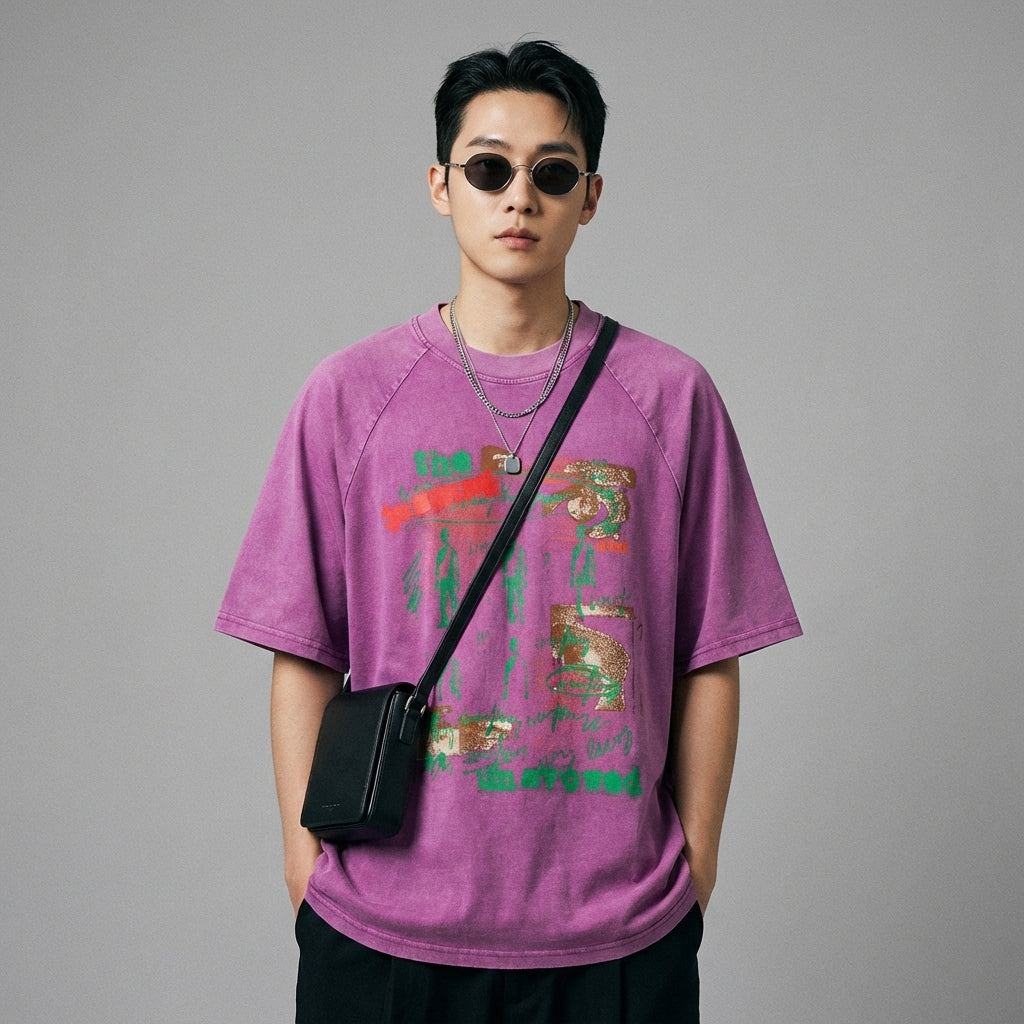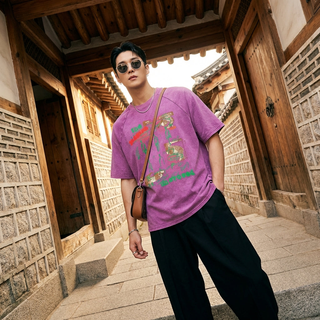 - Stil: Streetwear, Afslappet, K-fashion. Denne t-shirt udtrykker den afslappede og stilfulde æstetik inden for urban mode, inspireret af koreanske trends.