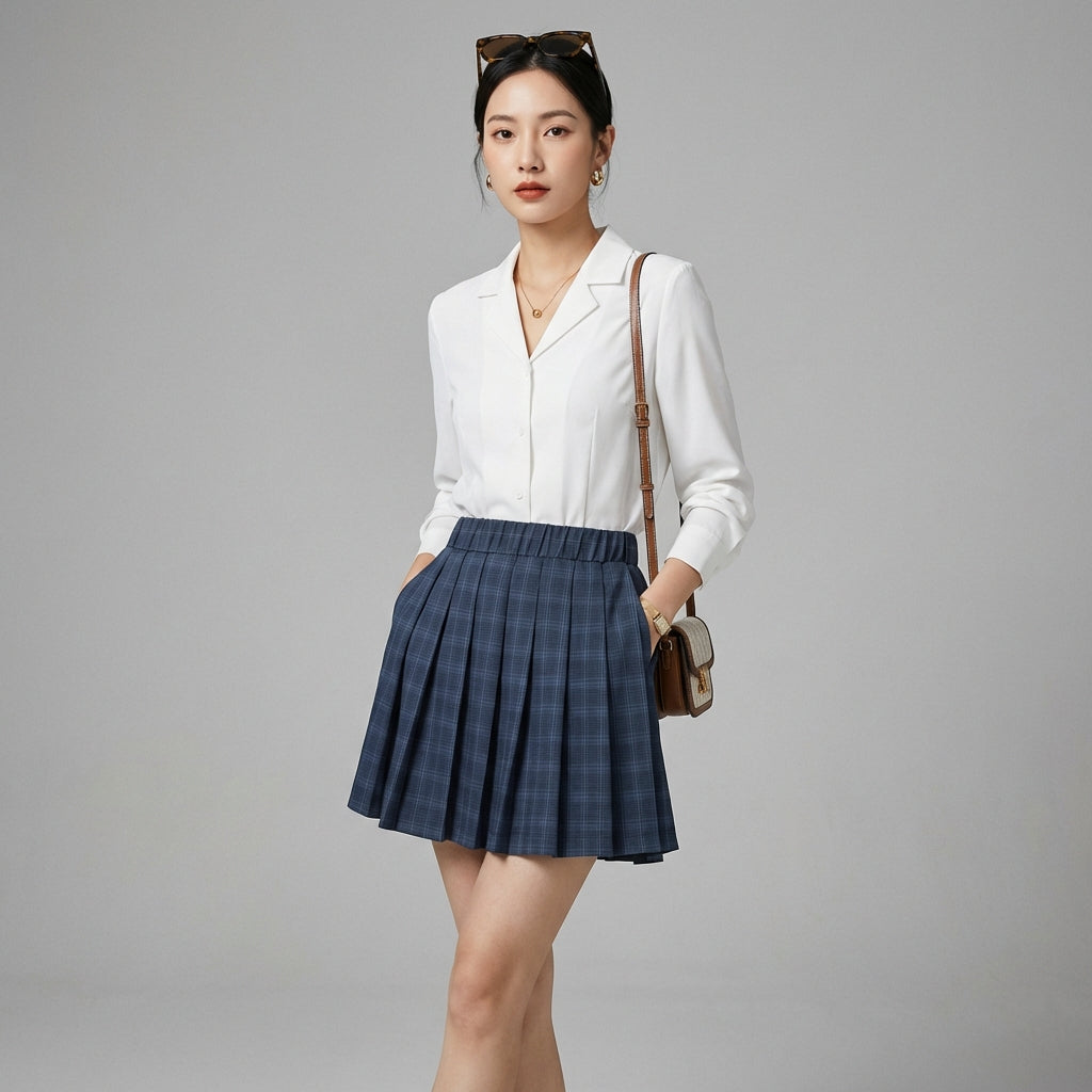 - Τύπος: Μίνι φούστα, Πλισέ, Ψηλόμεση. Ένα κοντό κόψιμο και δομημένες πτυχώσεις που επιμηκύνουν τη σιλουέτα και προσθέτουν κίνηση.