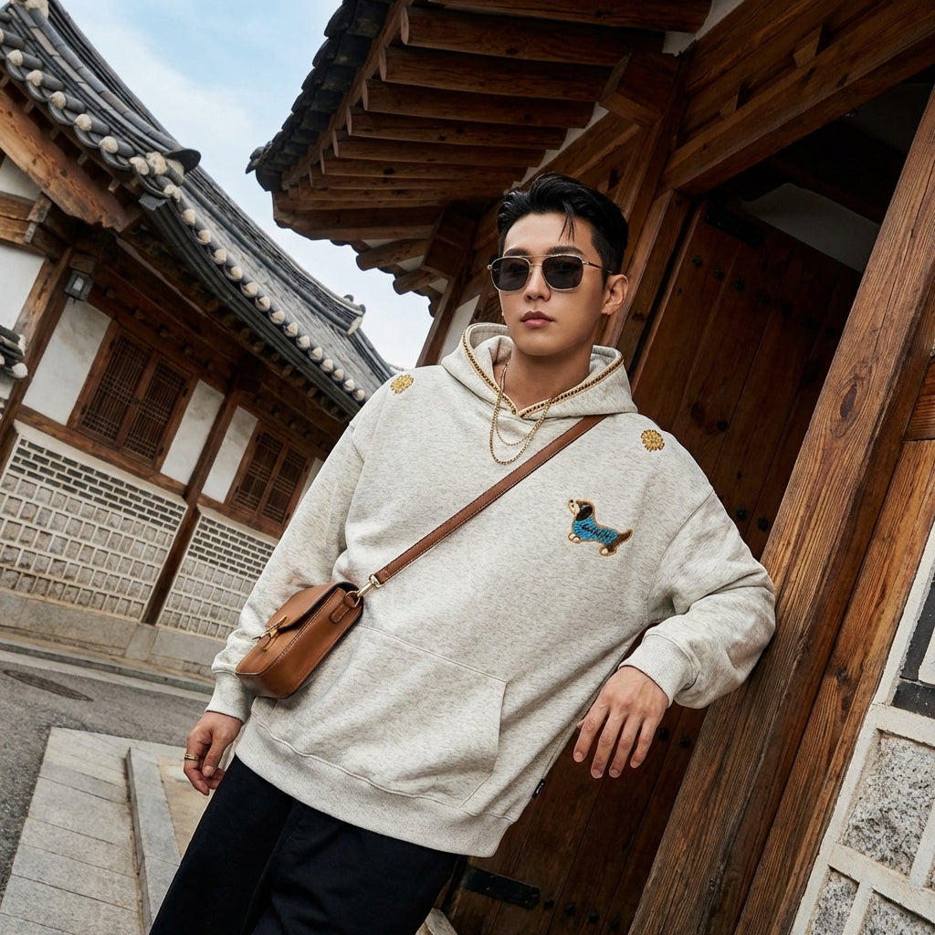- Style: Streetwear, Retro, K-fashion. This hoodie embodies the relaxed and trendy spirit of urban fashion, with a vintage touch inspired by Korean trends.