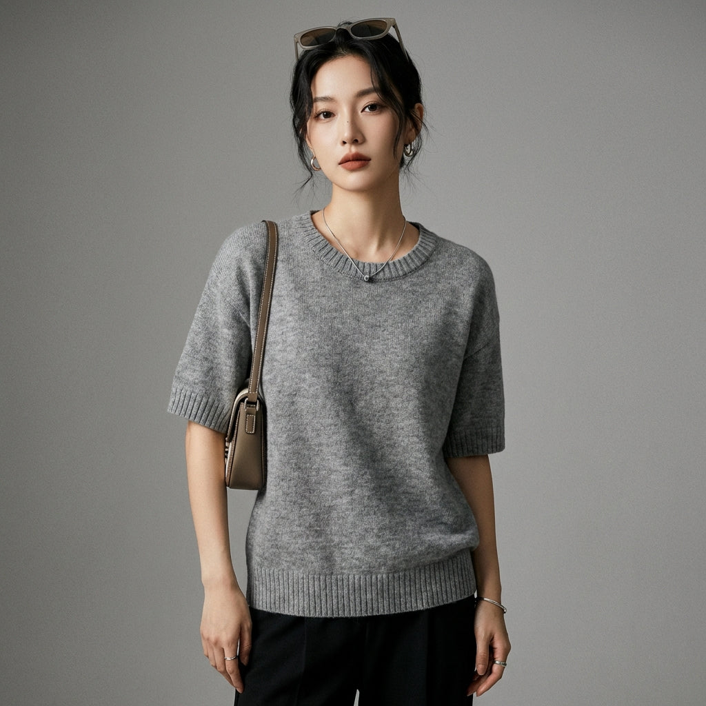 Pull tricoté gris à col rond et manches courtes pour femme - Koreanxwear