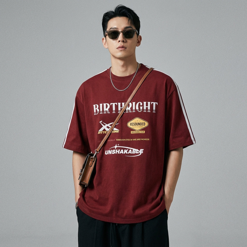 T-Shirt loose imprimé pour homme, style streetwear K-fashion, rouge foncé et vert olive. Idéal été.