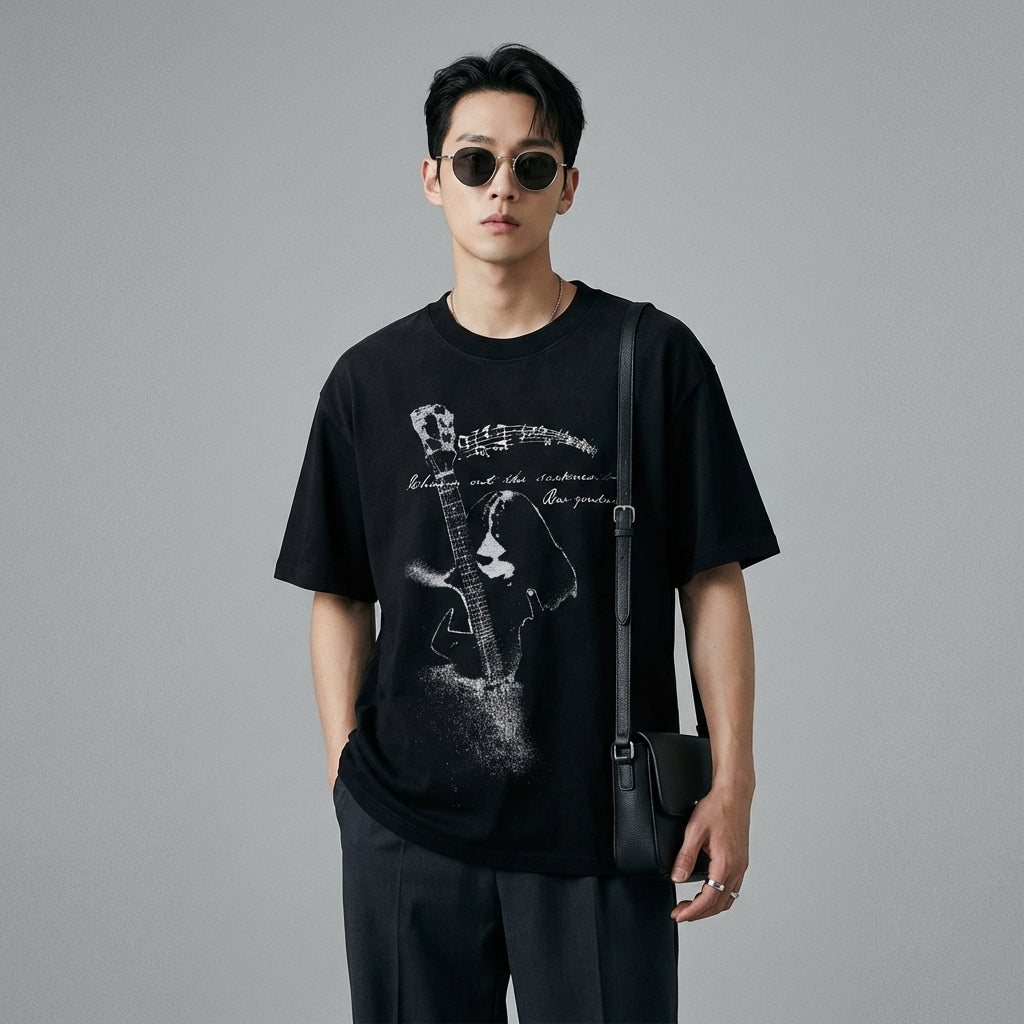 T-Shirt imprimé oversize rock noir en coton - Mode coréenne unisexe