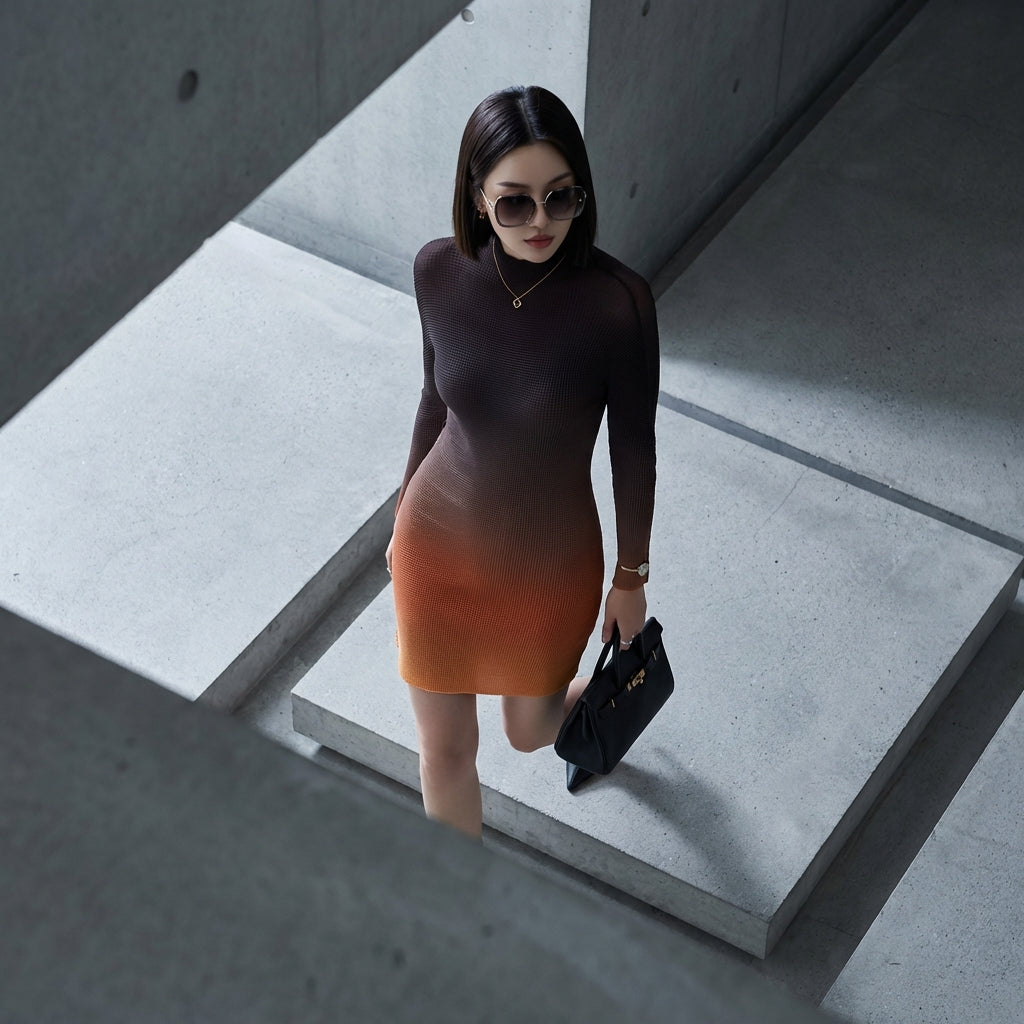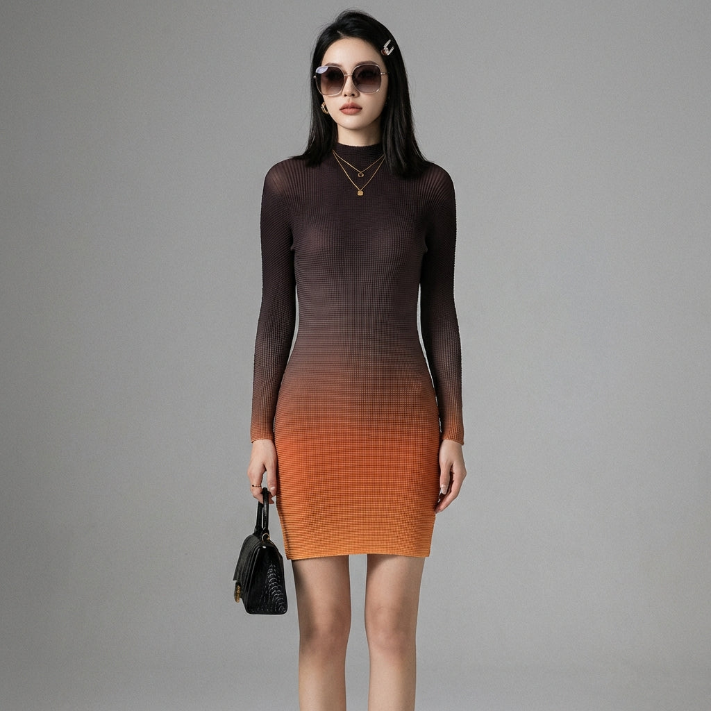 Embrace a modern and elegant look with our pleated gradient top. Its mock neck and long sleeves offer a refined silhouette, while the pleated pattern adds a touch of originality. Perfect for all occasions, it ensures comfort and style! ✨