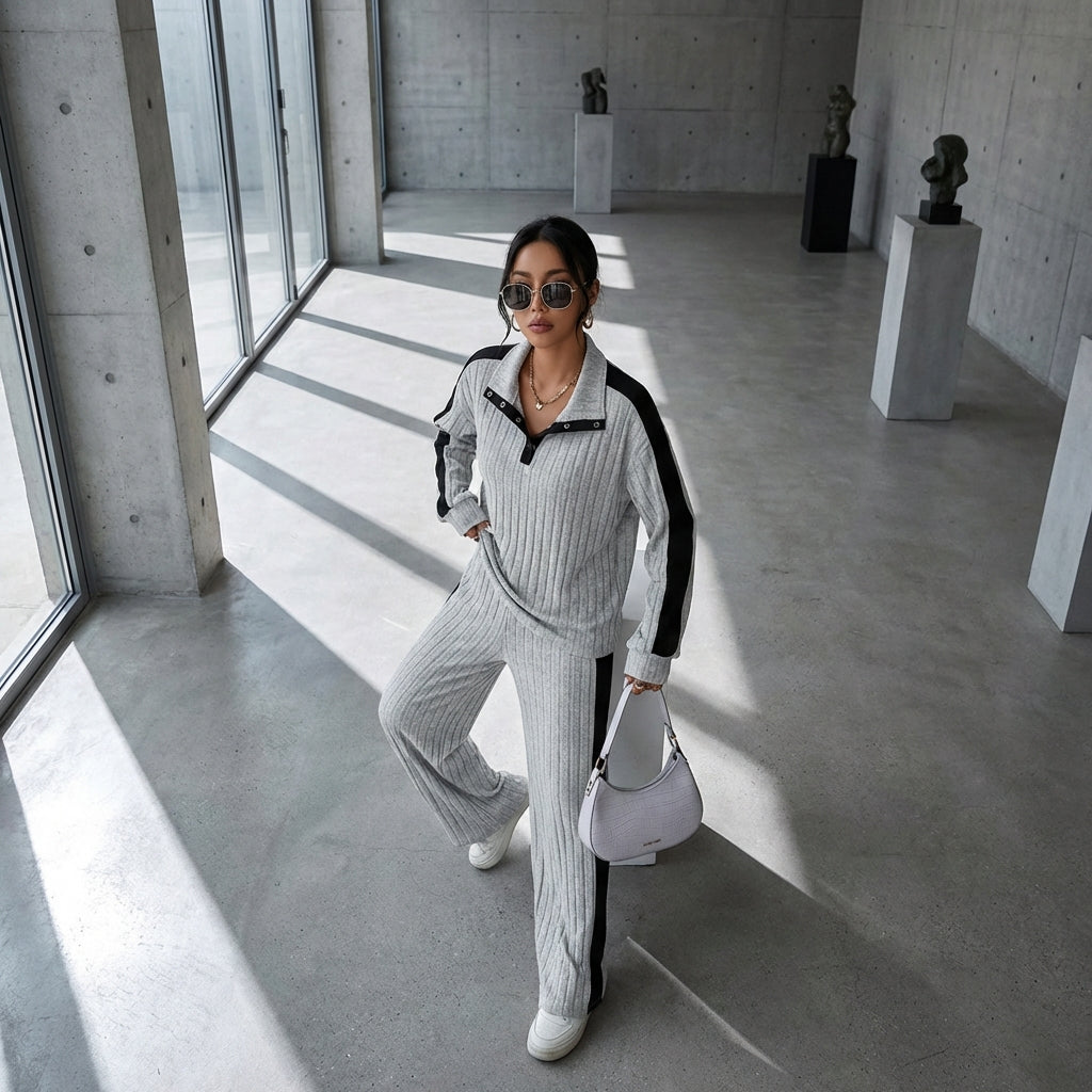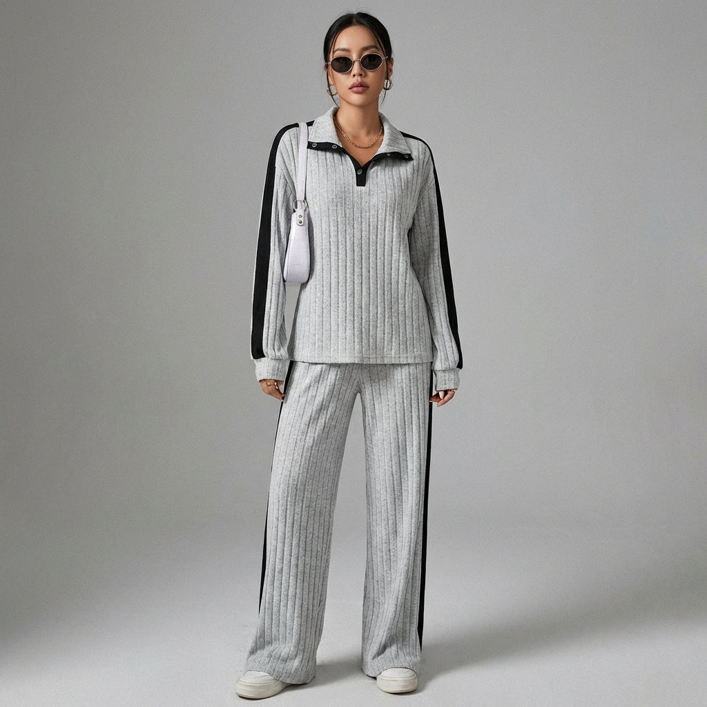 Ensemble décontracté femme gris, col contrasté, manches longues et pantalon taille haute. K-fashion moderne.