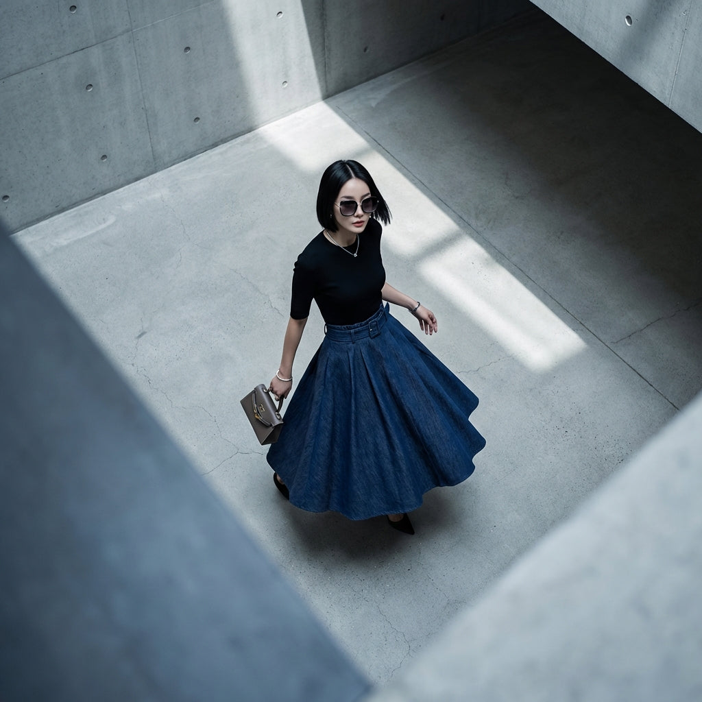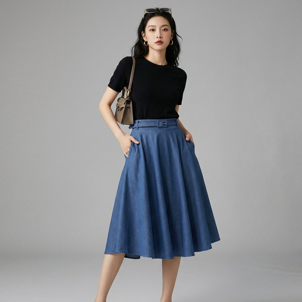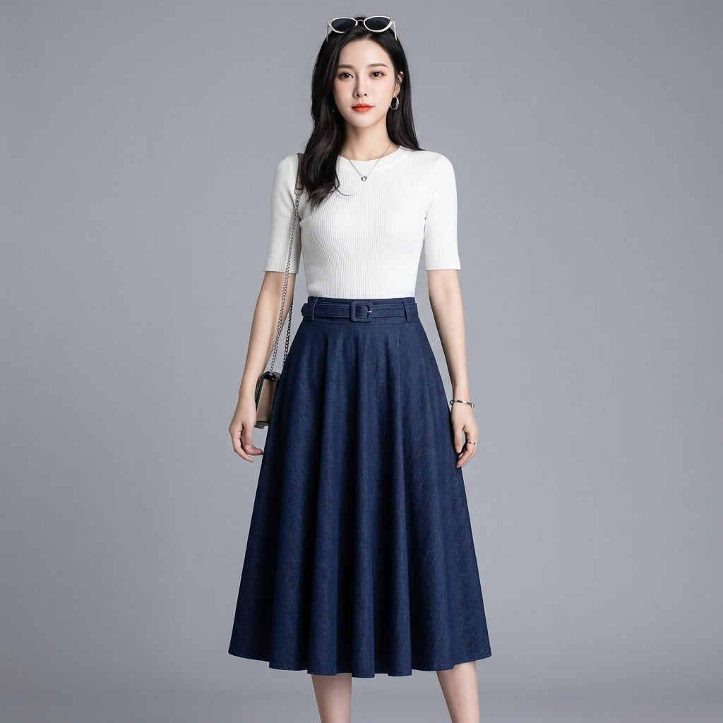 This denim skirt is the centerpiece for creating varied outfits, ranging from casual to more sophisticated looks, while remaining true to the aesthetic of Korean fashion.