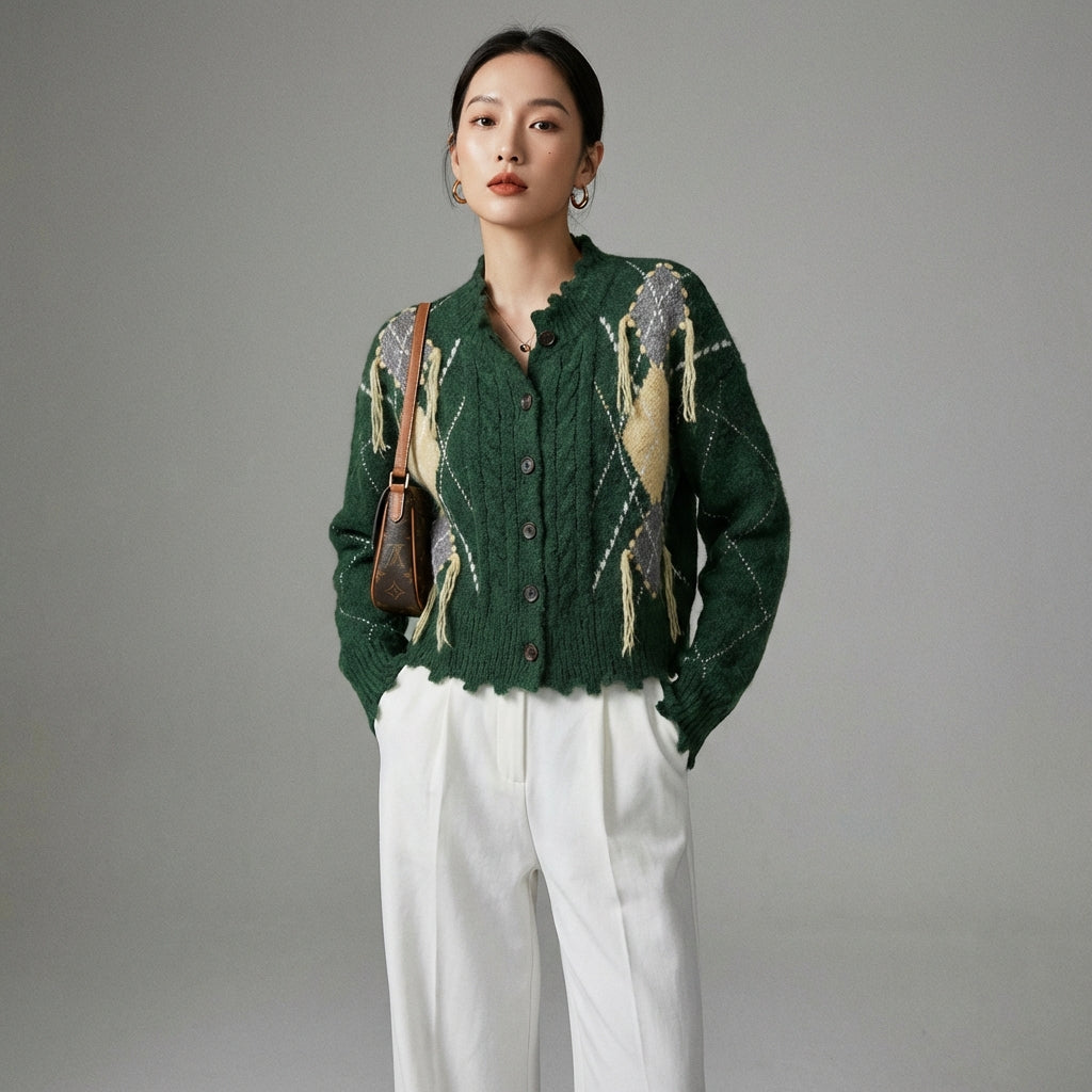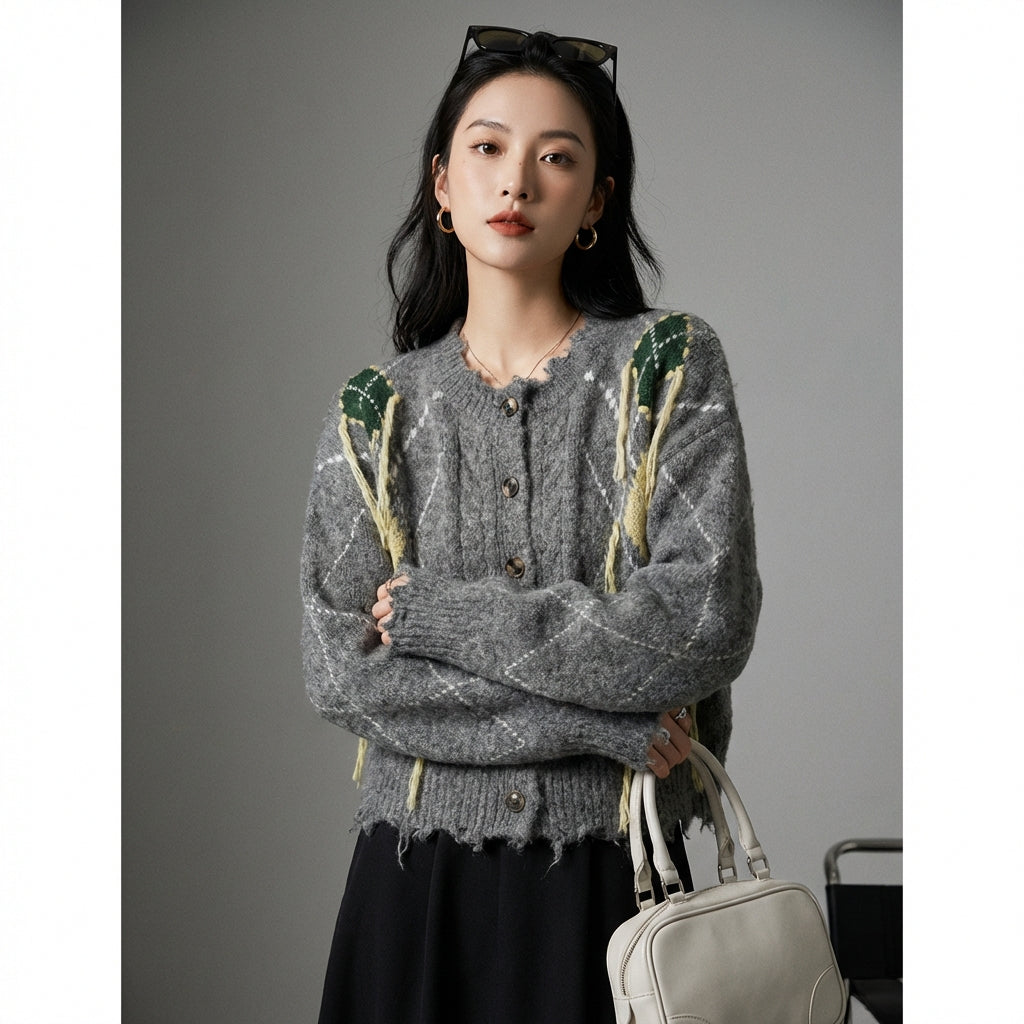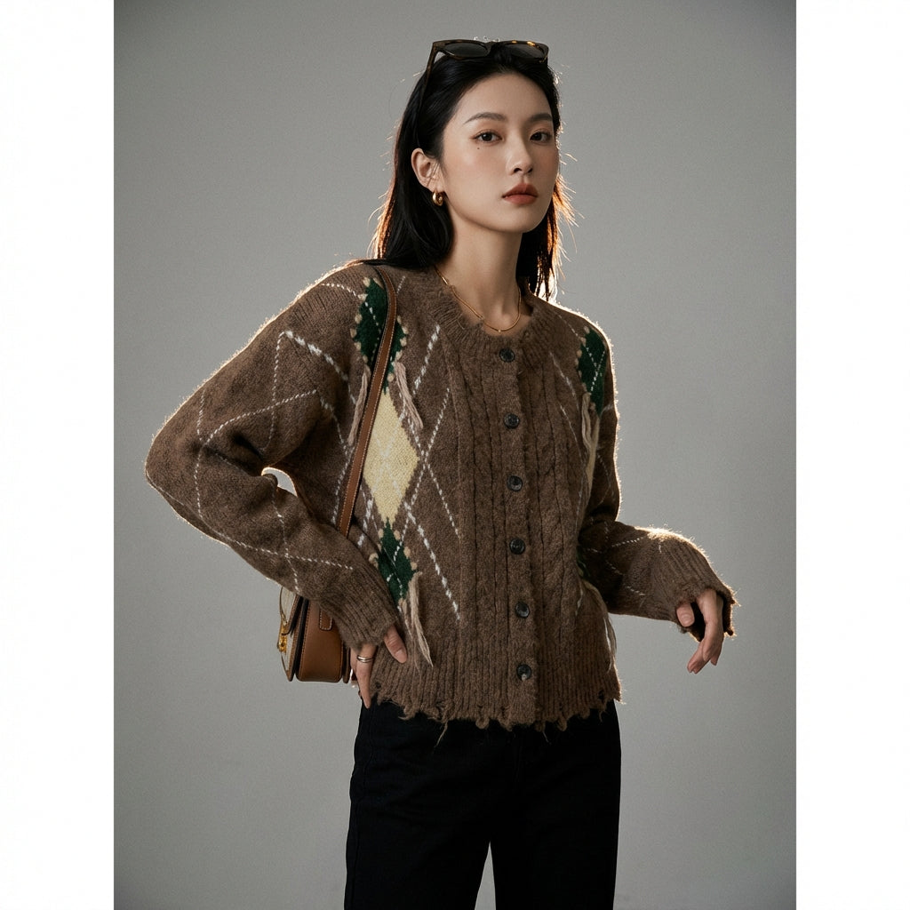 Embrace a relaxed yet chic look with our knitted cardigan, featuring a contrasting diamond pattern and pom-pom details. Its loose fit and "Lazy" style make it the perfect piece for optimal comfort without compromising on elegance. Ideal for layering and adding a touch of sophistication to your everyday outfits! ✨