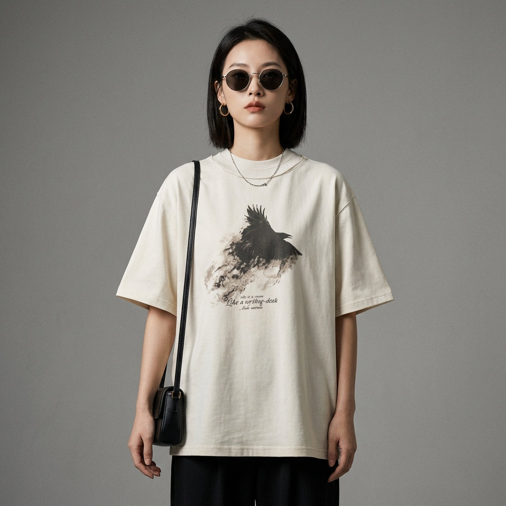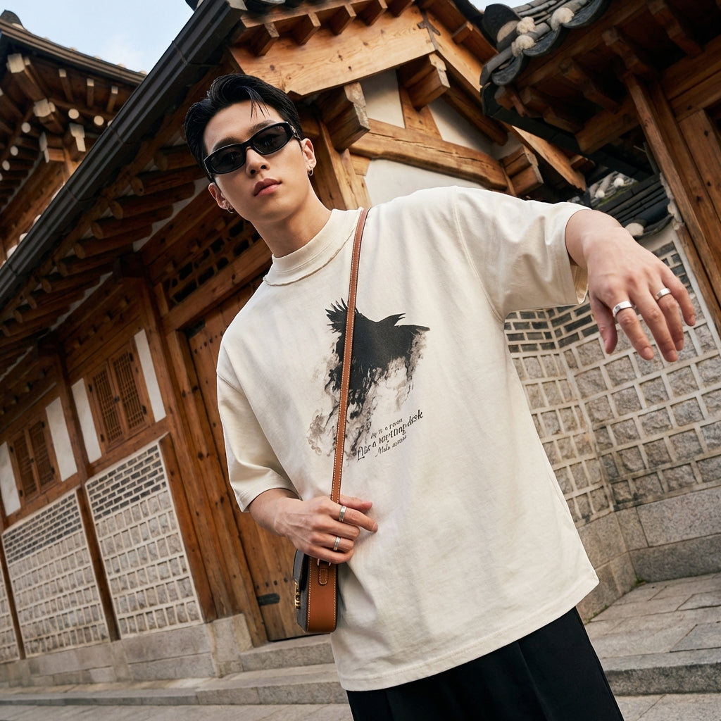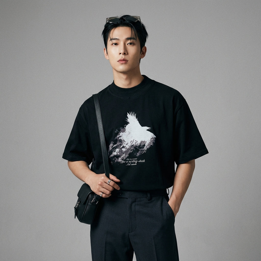 - Tyyli: Streetwear, K-muoti, Rento. Tämä T-paita ilmentää korealaisen muodin rentoa ja tyylikästä estetiikkaa, täydellinen urbaaniin lookiin.