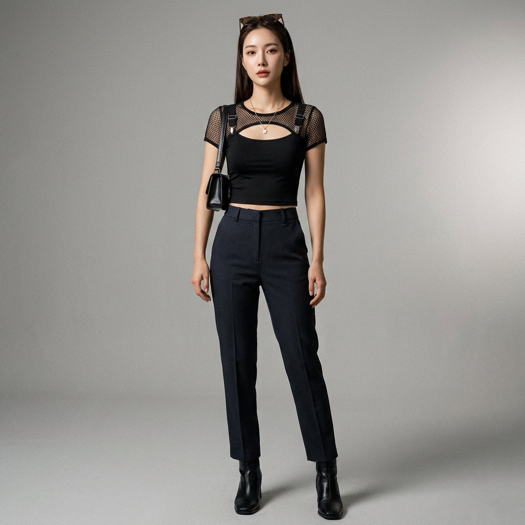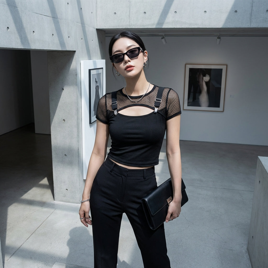 Korosta tyyliäsi mustalla slim-topillamme, joka on monipuolinen ja trendikäs perusvaate. Sen istuva leikkaus ja läpinäkyvät verkkoyksityiskohdat tuovat rohkean ja modernin lisän kaikkiin asuihisi, täydellinen iltalookiin tai tyylikkääseen streetwear-tyyliin! 🖤