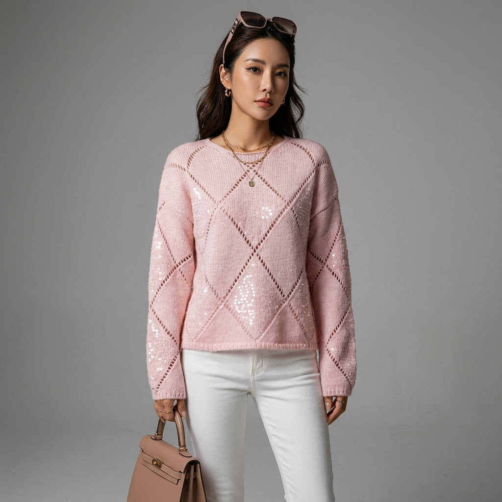 Luo lumoava ja rento tyyli väljällä neulepullollamme, jota koristavat herkät paljetit. Sen avoin timanttikuvio lisää ripauksen omaperäisyyttä ja naisellisuutta, täydellinen loistamaan missä tahansa tilaisuudessa! ✨
