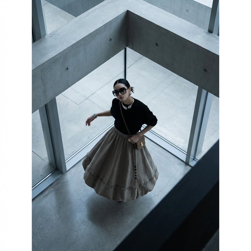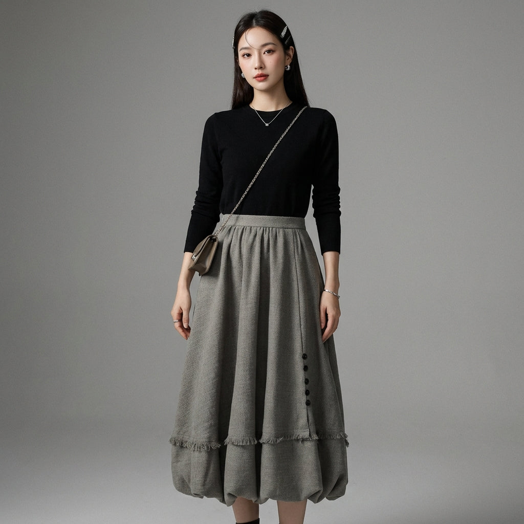 - Tyyli: Minimalistinen, Chic, K-fashion. Tämä hame ilmentää korealaisten muodin hillittyä ja modernia eleganssia, ihanteellinen hienostuneeseen lookiin.