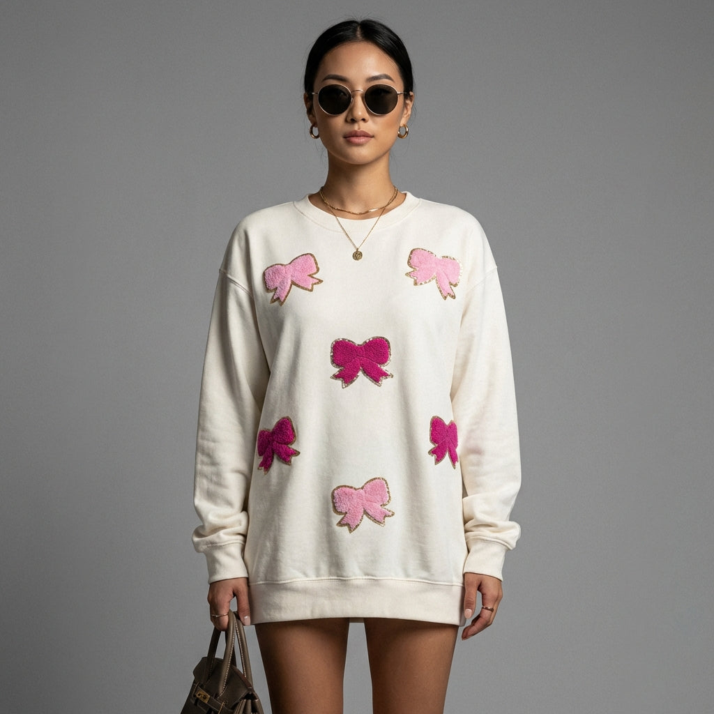 Ota käyttöön trendikäs ja mukava tyyli pitkähihaisella, pyöreäkauluksisella collegepaidallamme, jota koristaa herkkä rusettikirjailu. Täydellinen rentoihin päiviin ripauksella eleganssia! ✨