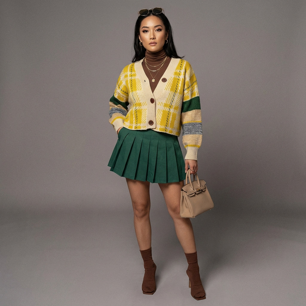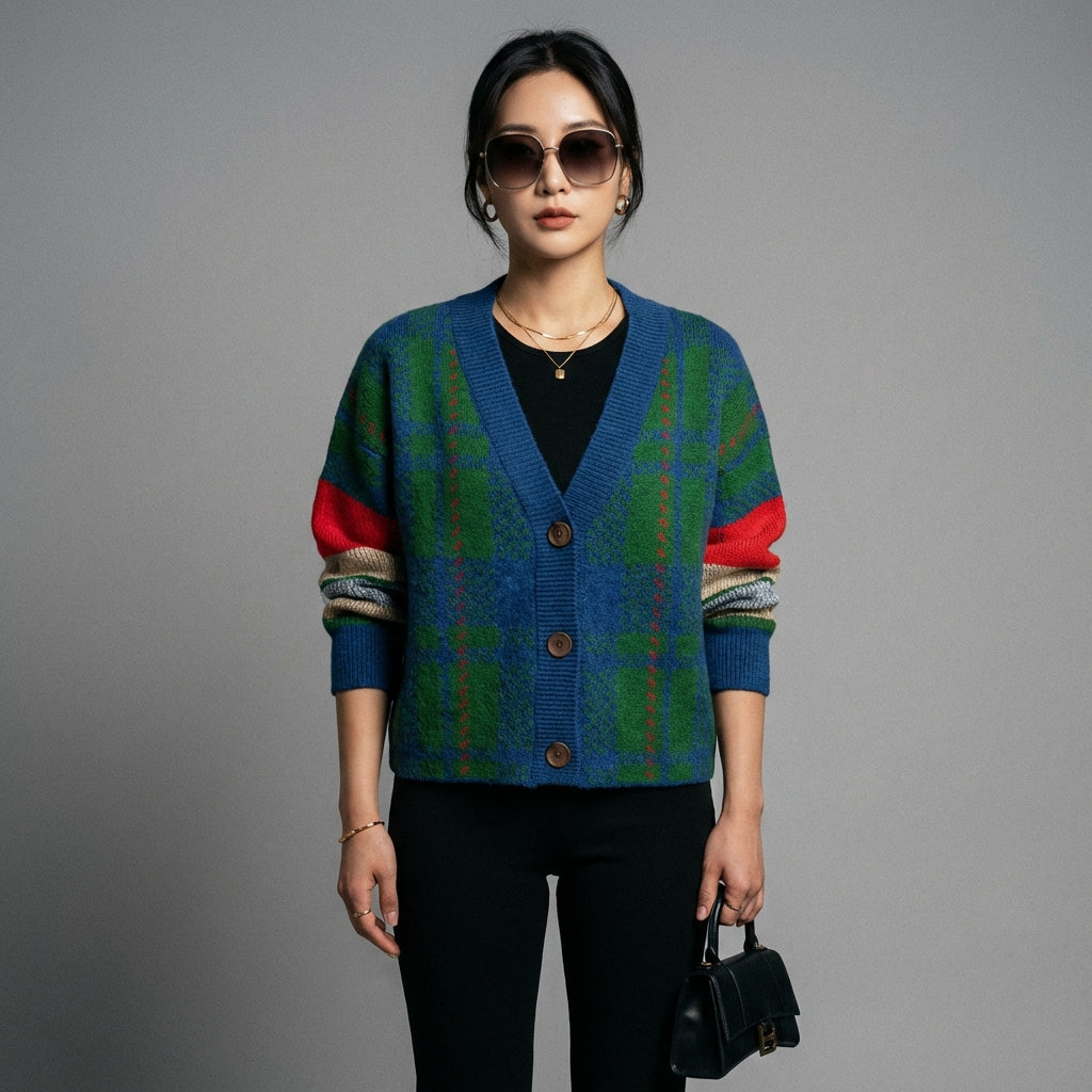 Luo rento ja tyylikäs look ruudullisella neuleneuletakkillamme. Tässä monipuolisessa mallissa on V-pääntie ja madalletut olkapäät, jotka luovat modernin oversize-tyylin. Täydellinen kerrostamiseen ja lisäämään ripauksen hienostuneisuutta arkipukeutumiseesi! ✨