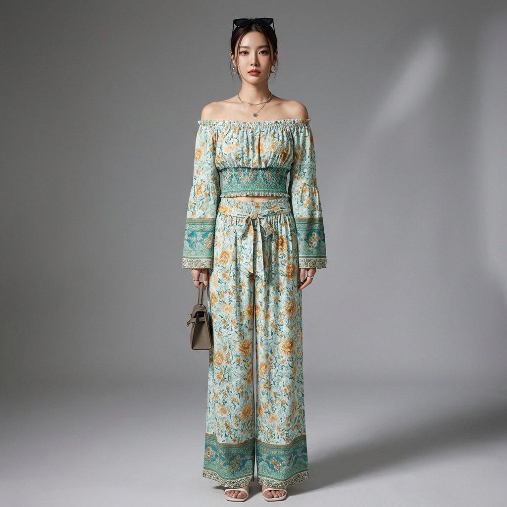 - प्रकार: दो पीस सेट, लॉन्ग-स्लीव टॉप, हाई-वेस्ट वाइड-लेग पैंट। एक आधुनिक और आरामदायक कट जो विभिन्न शरीर के प्रकारों के अनुकूल होता है।