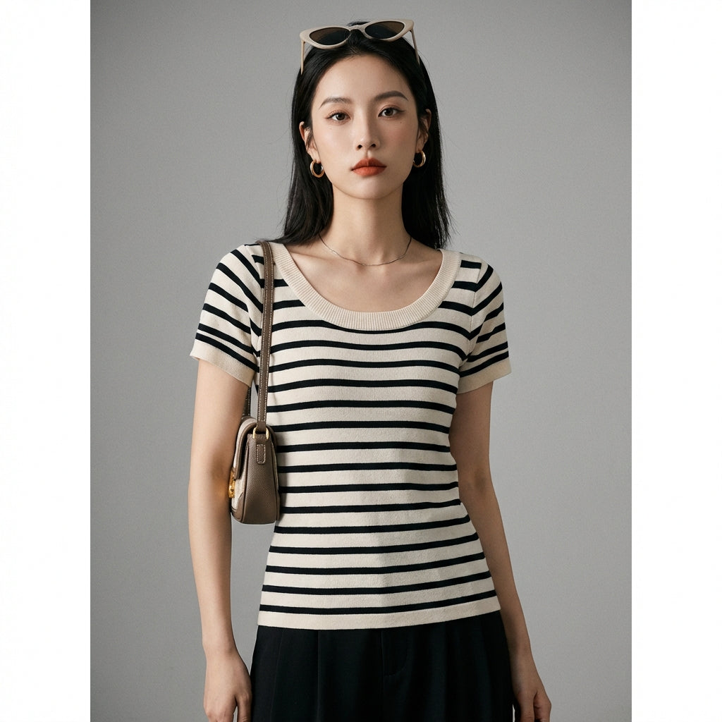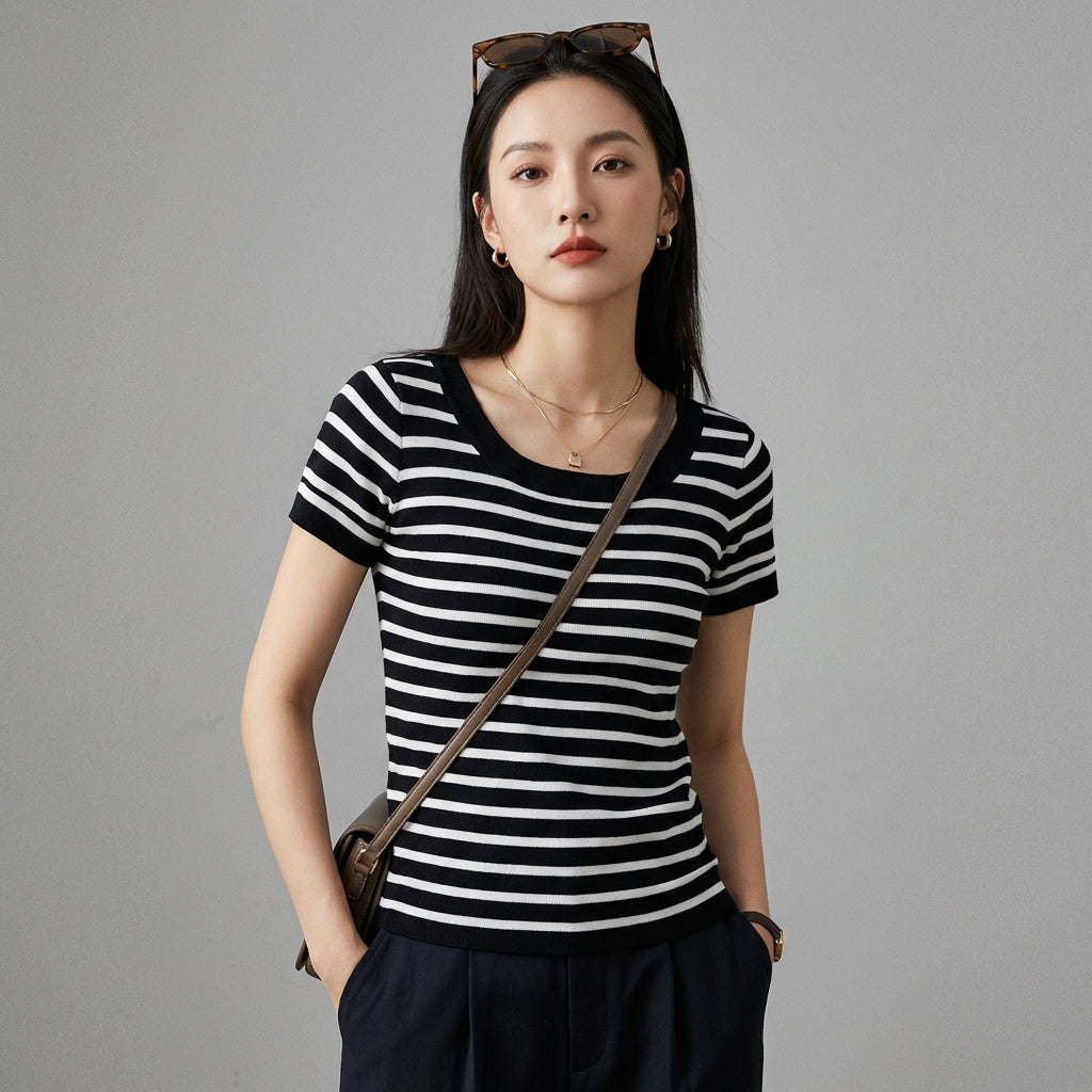 हमारे धारीदार बुने हुए टॉप के साथ एक आरामदायक और स्टाइलिश लुक अपनाएं, जो सभी अवसरों के लिए एकदम सही है। इसका गोल गला और स्लिम फिट आपके फिगर को खूबसूरती से निखारता है। एक ट्रेंडी वॉर्डरोब के लिए ज़रूरी! ✨