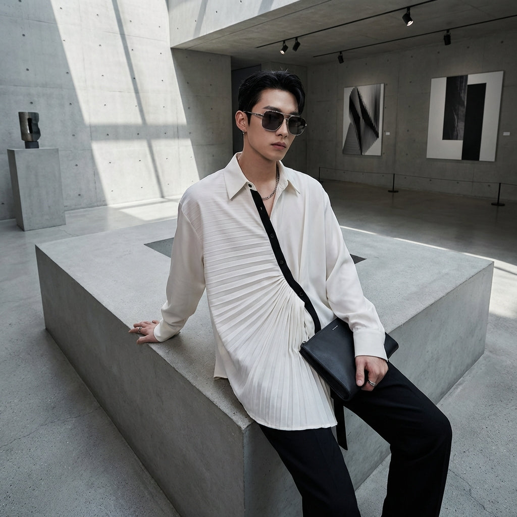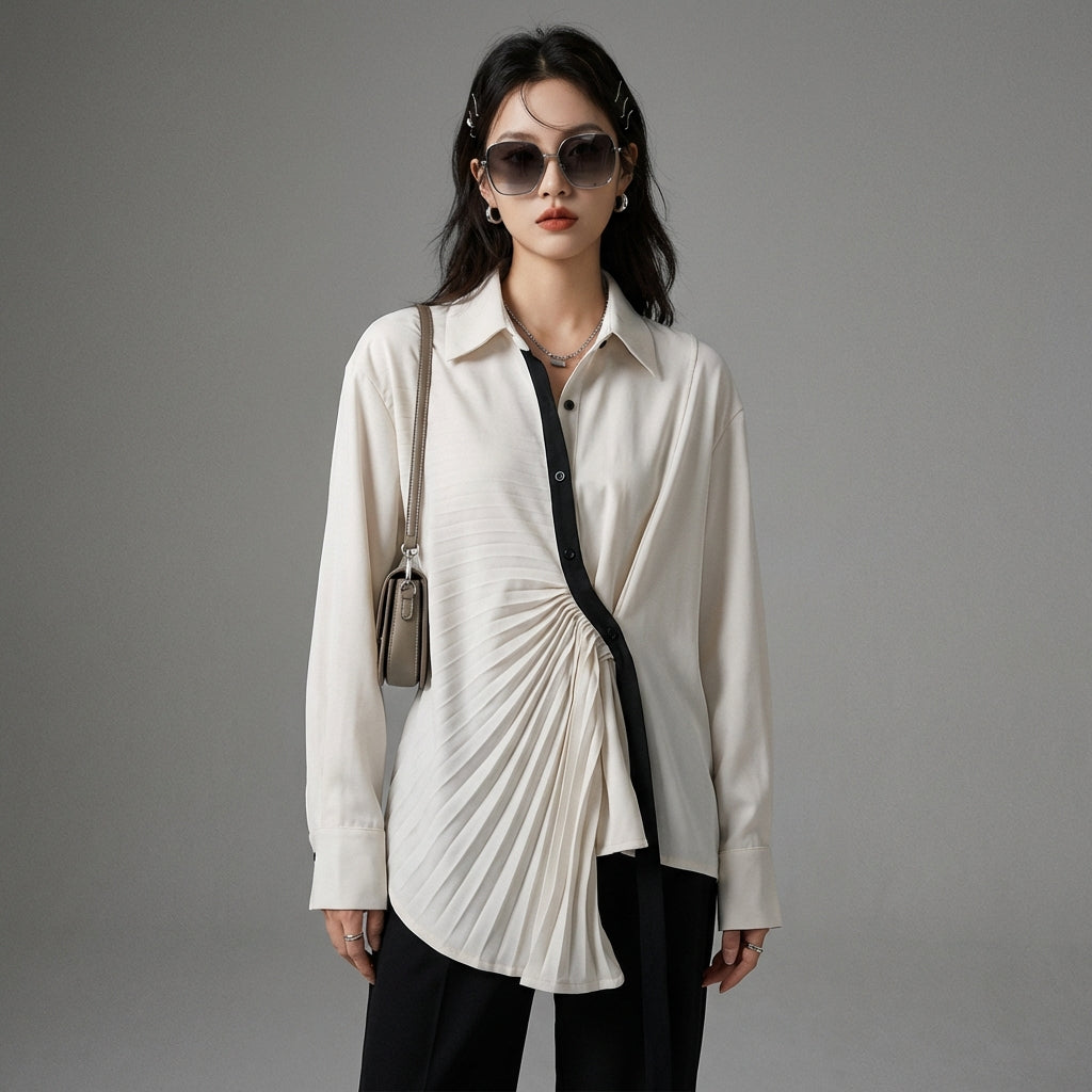 Chemise plissée bicolore manches longues - K-fashion décontractée