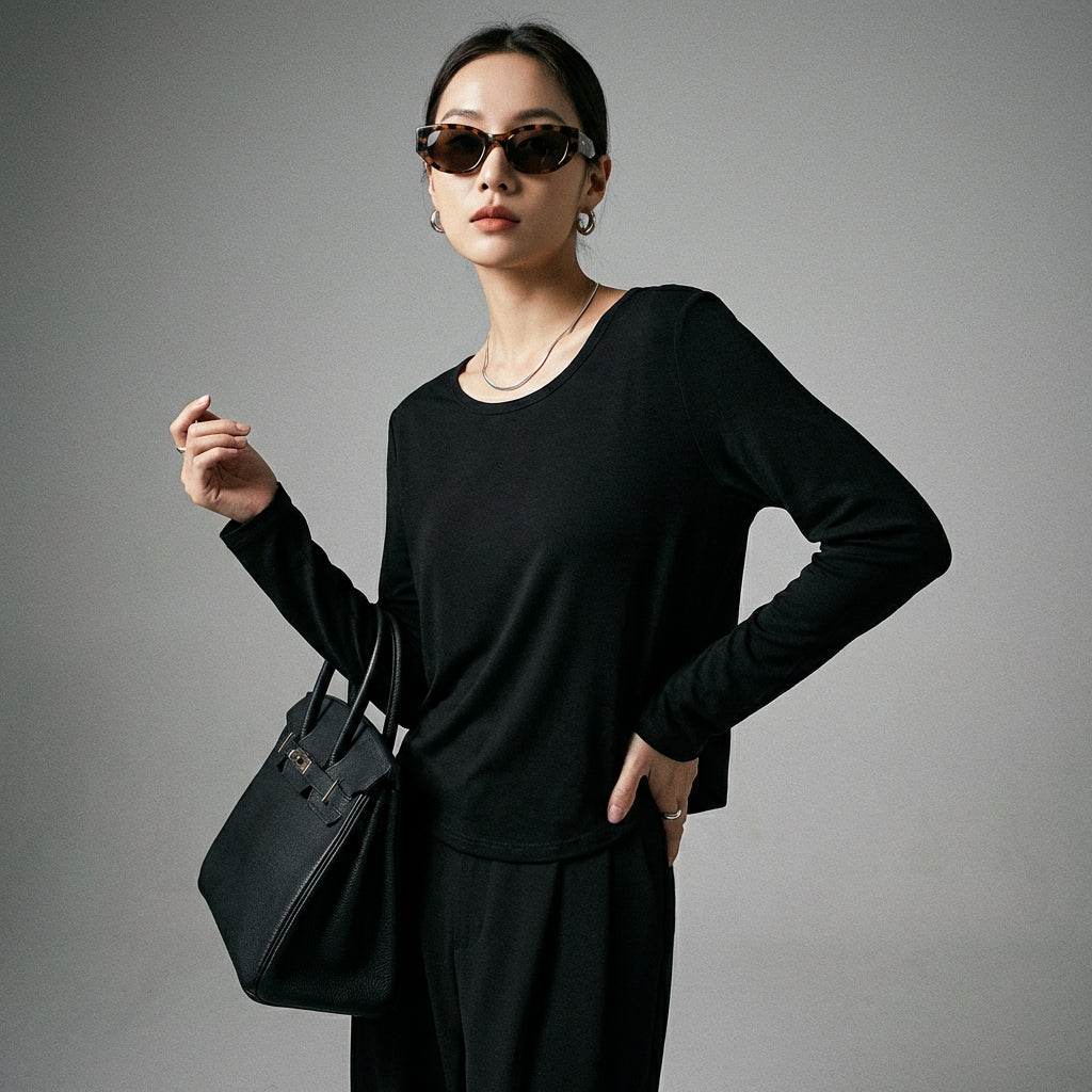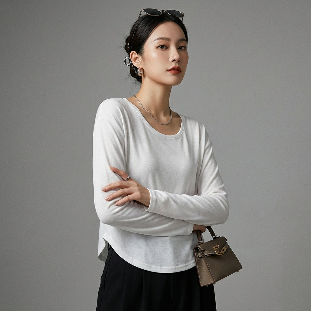 इस लंबी बाजू वाली, गोल गले की टी-शर्ट के साथ एक कैज़ुअल और स्टाइलिश लुक अपनाएं। इसकी ढीली फिटिंग और न्यूनतम डिज़ाइन इसे कोरियाई फैशन से प्रेरित सभी वार्डरोब के लिए एक बहुमुखी आवश्यक वस्तु बनाती है! ✨