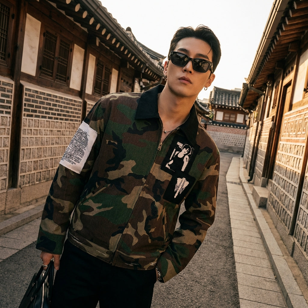 अपनी अलमारी में मौलिकता और चरित्र का स्पर्श जोड़ने के लिए इस डेनिम कैमोफ्लेज जैकेट का चयन करें, जबकि कोरियाई रुझानों में सबसे आगे रहें।