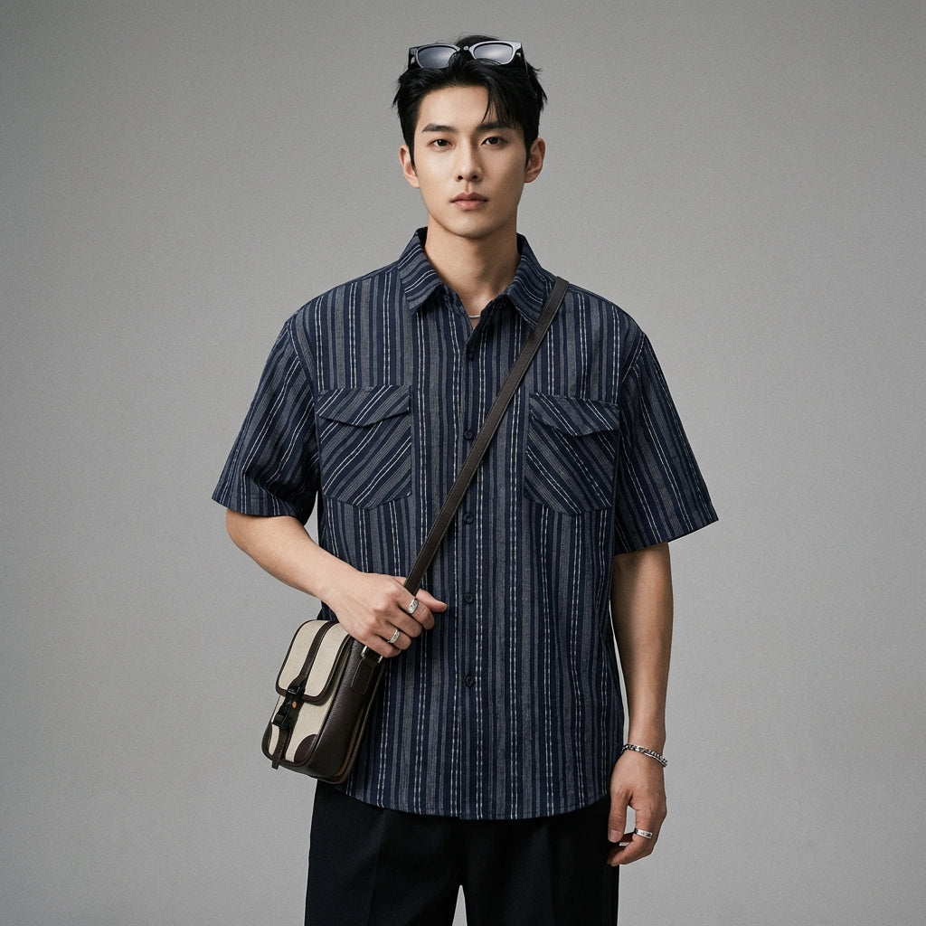 हमारी धारीदार आधी बाजू वाली शर्ट के साथ एक आरामदायक और ट्रेंडी लुक अपनाएं। इसका ढीला डिज़ाइन और डबल पैच पॉकेट शहरी और कार्यात्मक शैली का स्पर्श जोड़ते हैं, जो आपकी गर्मियों के दिनों के लिए एकदम सही है! 👕